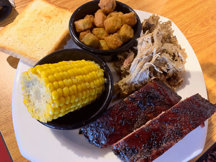 1 January 2020: Pulled pork and ribs graced my Kim’s two meat plate. Tender tendrils of pulled pork were a hugestyle=”border: 4px solid black; margin-top: 3px; margin-bottom: 3px;” success with my bride. While pulled pork can dry out easily and often lacks much flavor, Triple B’s version delivered an array of tastes and textures–smoky, sweet, juicy and tender. The pulled pork pairs nicely with the Carolina Gold sauce, just as it does in the Carolinas where the swine is fine and pork is king. My Kim’s sides were corn on the cob and okra, both of which she enjoyed immensely.