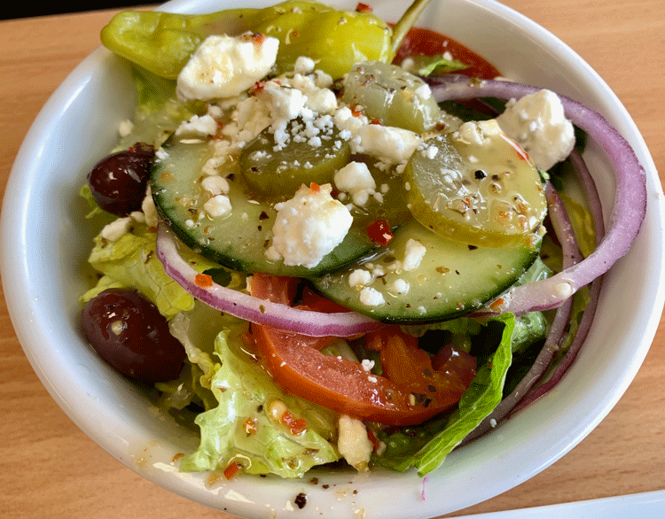 20 January 2020: Sr. Plata opted for the salad, a bowl of Romaine lettuce, sliced tomatoes, red onions, thinly sliced cucumbers, kalamata olives, pepperoncini, pickles and feta cheese. Despite being pitted, the brine-cured olives aren’t as mushy and overly salty as pitted olives tend to be. The pickles are both spicy and sour, a truly delightful combination. Fetid feta is a nice foil for the fresh, crispy veggies while an olive oil and vinegar dressing provides subtle notes that play well with the other salad ingredients without taking anything away.