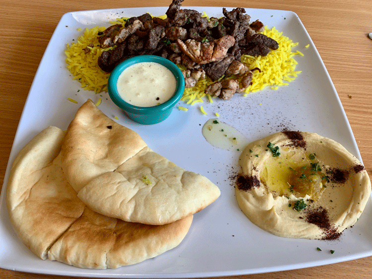 20 January 2020: Sr. Plata’s entree from the Jerusalem’s Specials was the shawarma combo (beef, chicken and lamb shawarma served with rice, hummus, and freshly baked pita bread). All three meats proved juicy, tender and well-seasoned with an essence of having been marinated and roasted slowly. The meats are served with a pungent garlic sauce though we would have preferred tzatziki. Similarly we would have preferred baba ghanoush over hummus, but that’s a lesson learned for next time (and there will be a next time). The rice is fluffy and light with no clumping anywhere.