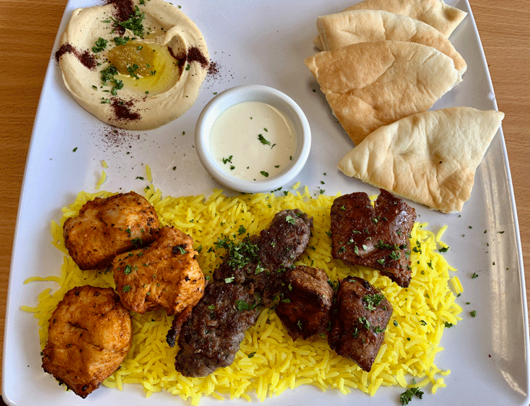 20 January 2020: My choice was the mashawi combo (a combination of beef kafta, chicken and lamb kabobs served with rice, hummus, and freshly baked pita bread). The term mashawi means any meat or vegetable that can be roasted or barbecued. Whereas the shawarma was cut into small pieces, the beef, chicken and lamb were individual one bite chunks. Because the meats are larger, they seem to have a better distribution of spices. The lamb in particular is prepared at about medium whereas its shawarma counterpart is closer to well-done. For juiciness, tenderness and flavor, the mashawi combo is superior to the shawarma combo.
