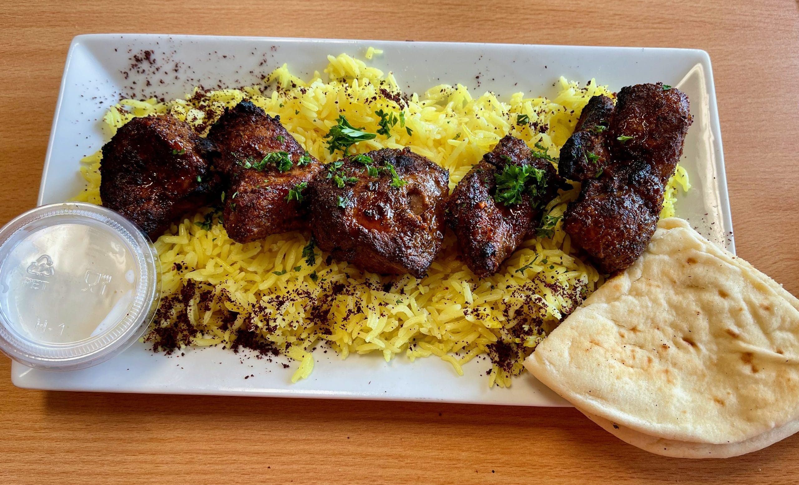 Order a kabob or gyros at Jerusalem: A Taste of the Holy Land and what arrives at your table are the meats extricated from their respective skewers. If you want those meats nestled in pita, you have to order a “gyros sandwich” or “kabob sandwich.” Not to worry. A kabob meal includes five skewers of wonderfully seasoned lamb, traditional basmati rice, pita and garlic sauce. Here’s another caveat emptor–if you’re used to lamb being served at the medium-rare degree of doneness, you might be surprised at the medium-well texture and flavor of some kabobs. As with any lamb dish seasoned and prepared well, the deliciousness and tenderness of the lamb still shines through.