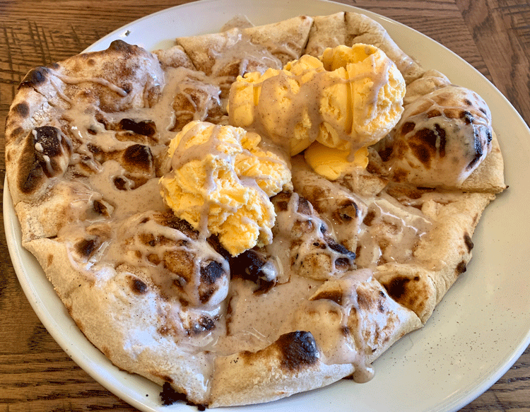 8 February 2020: Baked goods are on full display under glass at the counter where you place your order. They’re supplied by Swiss Alps Bakery and they look fabulous. The Marigold Cafe also offers a unique dessert made on the premises. It’s called cinna-naan and as the name hints, it features both cinnamon and tandoor-baked naan. A rather large naan is first slathered with butter then sprinkled with cinnamon and a caramel sauce before three generous scoops of ice cream are piled on. It’s an amazing dessert, the best we’ve had in 2020 thus far.