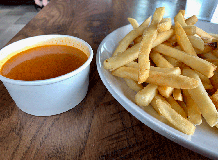 10 February 2020: Accompanying burger and sandwich options is your choice of fries, sweet potato fries, onion strips, coleslaw or side salad. The prospect of experiencing more of the tikka sauce made fries a natural choice. Think really good, really creamy, delightfully aromatic tomato soup with lots of personality. As with many exemplars of comfort food, it’s served hot. You’ll want to saturate the fries with this elixir, but make sure to save a sip or three for the end.