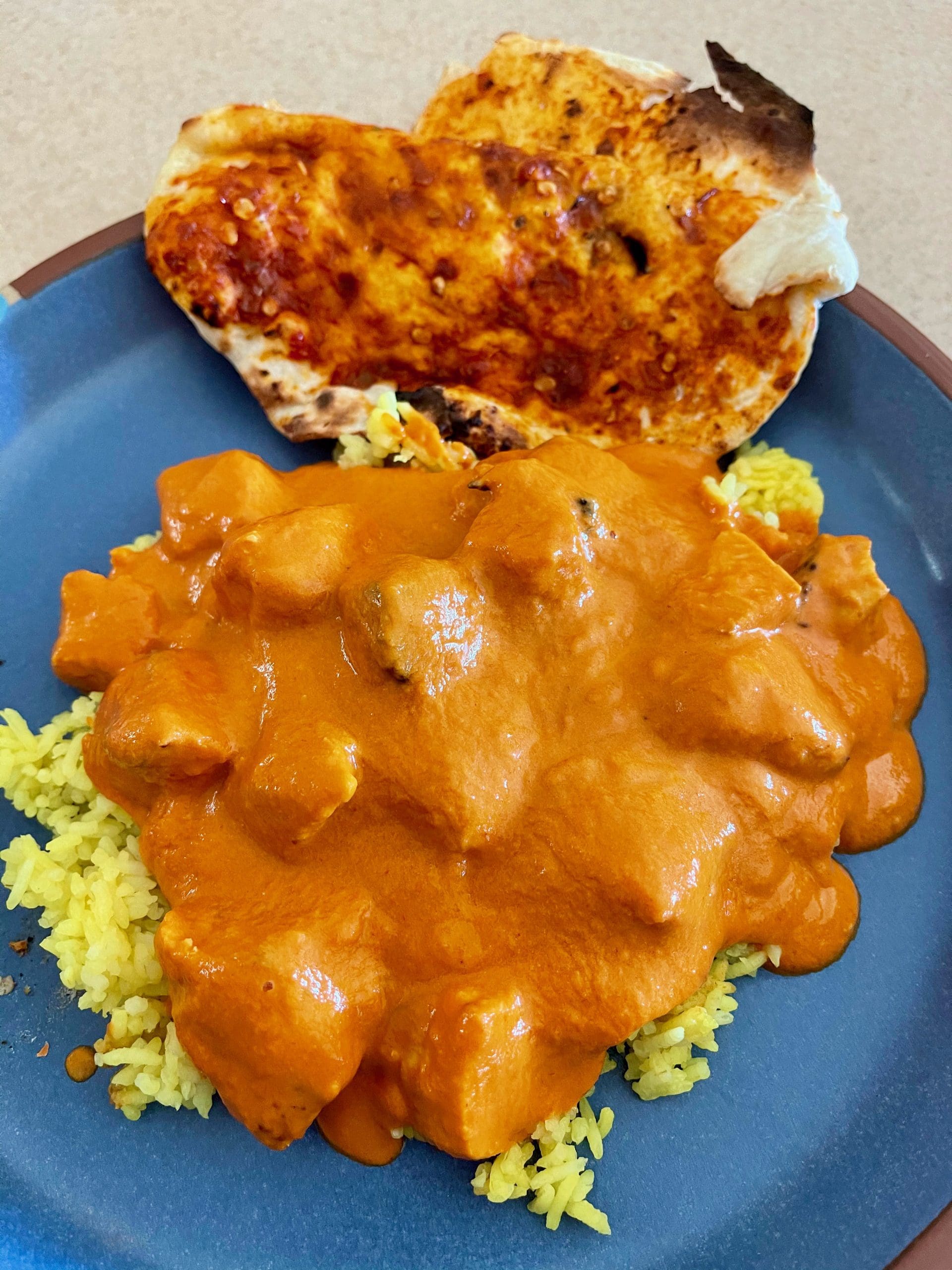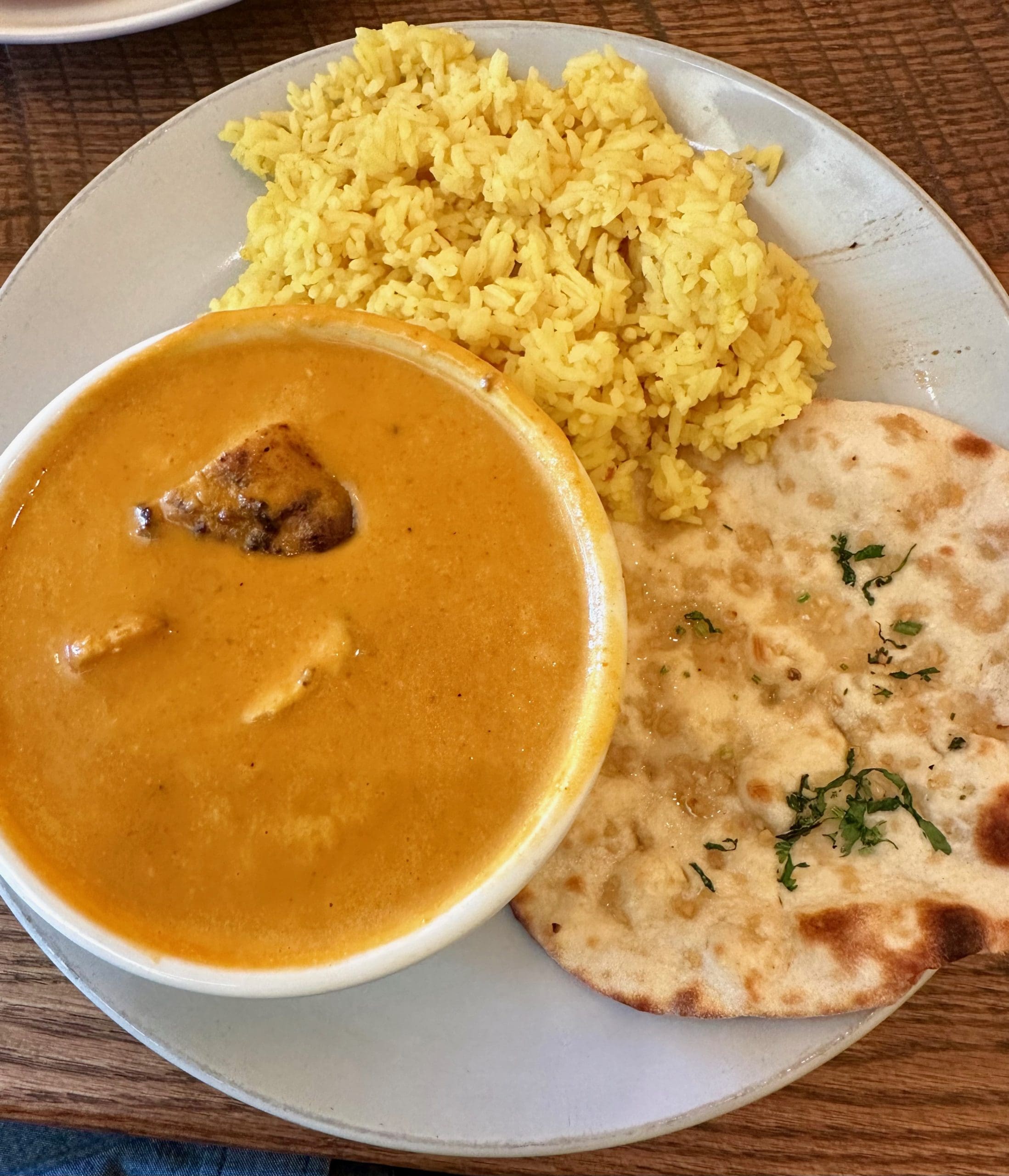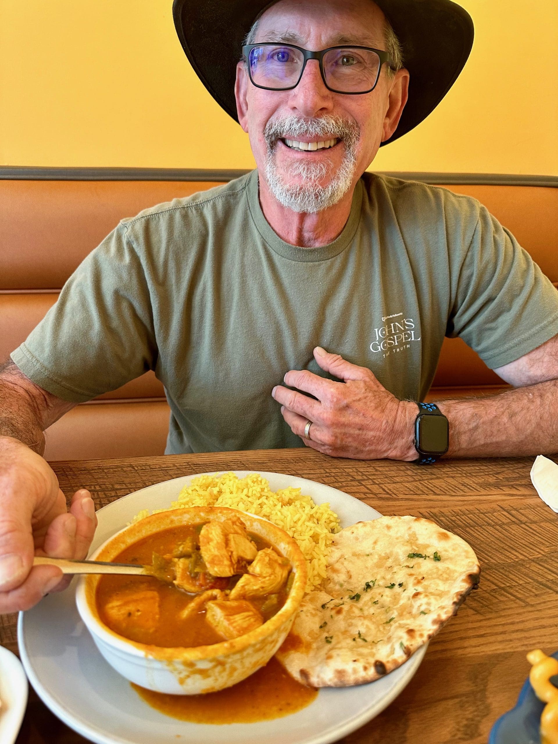 25 July 2024: In the mood for Indian curry, but not wanting to travel to the Northeast Heights, my friend Bruce “Sr. Plata” Silver was thrilled to peruse Marigold Cafe’s menu and espy not only the variety of dishes, but the diversity of cultures represented on the menu. During his inaugural visit, he opted for a New Mexico meets India dish of green chile chicken curry (Indian curry with slow-cooked chicken and green chile) served with a fluffy seasoned rice and both the garlic naan and the chili naan.