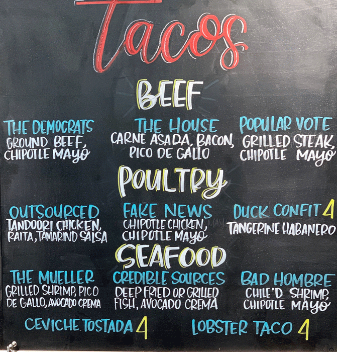 Despite the old maxim that you should never discuss politics or religion at the table, Urban Taqueria practically invites diners to discuss politics even as they’re perusing a menu that names its food items for politically charged topics of our time such as “Lock Her Up,” “The Mueller,” “Fake News,” “Wikileaks,” “The Stormy” and “The Wall.” These are topics about which most of us have an opinion one way or another. The key, as Hanif implied is to have a conversation, not to storm out in a huff. Besides, once you’ve sampled the tacos and burritos for which these edgy topics are named, you’ll be talking about those tacos and burritos.