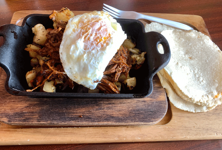 16 February 2020: Hanif confided that his favorite brunch item is the homemade hash and potatoes with barbacoa or vegetables, roasted peppers and corn topped with a fried egg prepared your way and corn tortillas on the side. Writer Ambrose Bierce’s had it all wrong when he declared that “nobody knows what hash is.” Urban Taqueria certainly knows hash, and if it doesn’t, its facsimile of this chopped meat dish is one of the most satisfying and delicious dishes you’ll ever have for brunch. Barbacoa is the star of this dish, a jumble of shredded tendrils of tender lamb. Cubed papitas add both a crispy, craggy exterior and tender exterior that holds up very well even when dragged through golden liquid egg yolk.