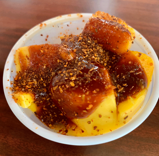 16 February 2020: You no longer have to travel to Mexico to experience fruit cups, an ubiquitous Mexican snack sold in street markets and restaurants alike. It’s typically made with fresh fruit that’s been cubed or cut into long spears, stacked into clear plastic cups and topped with Tajin chile lime seasoning, chamoy sauce and lime juice. Urban Taqueria’s rendition of the fruit cup (diced mangoes, tajin, chamoy, lime juice) is as good as any you’ll find in the Land of Montezuma. Since introducing my Kim to chamoy (a syrupy sauce made from pickled fruit mixed with spicy chiles and a salty brine), she’s craved that perfect blend of sweet, sour salty and spicy deliciousness which pairs beautifully with sweet fruit. It’s become an obsession for both of us.