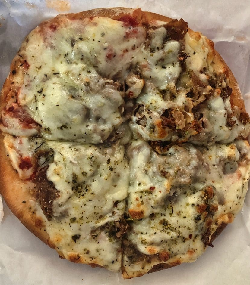 22 May 2020: Also from the specialty pizza menu comes the Gyros pizza (gyros meat, onions, tomatoes, cheese), a Greece meets Italy tribute that’s about as pretty as a pie can be. It’s splayed out like a sunburst with rounded red tomato slices peeking out from a molten blanket of cheese. As with the cheesy beef pizza, tomato sauce is a bit of an anomaly. Tomato sauce isn’t something you normally associate with gyros. Once you get past that, you’ll enjoy this pie. AK Pizza even serves up a side of tangy tzatziki sauce worthy of gyros in Athens.