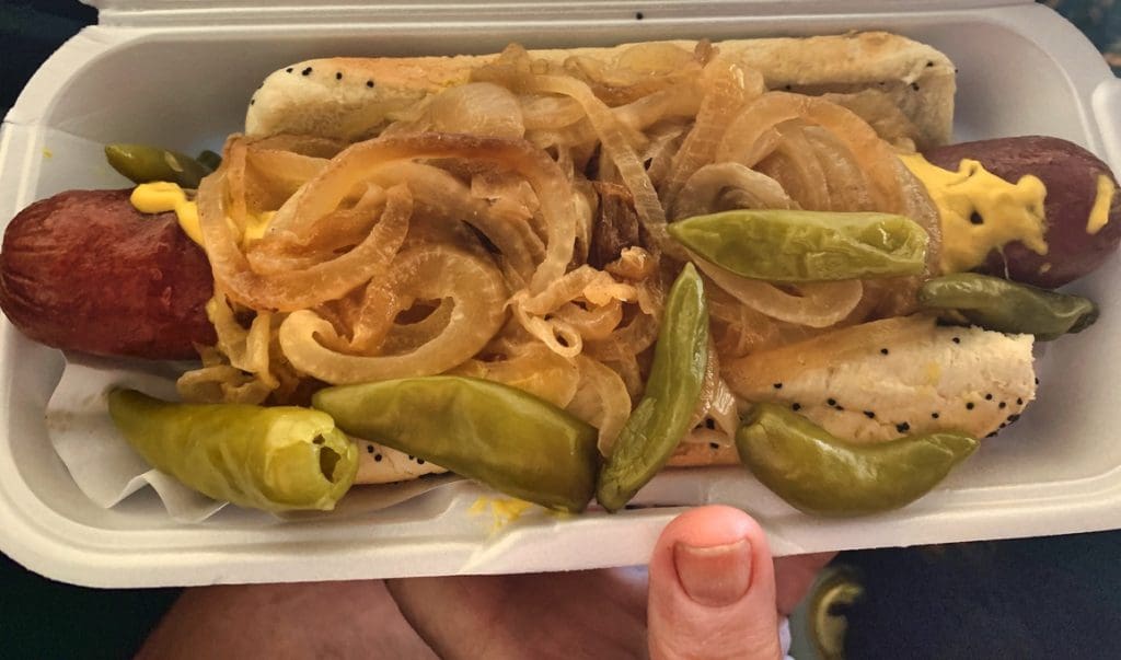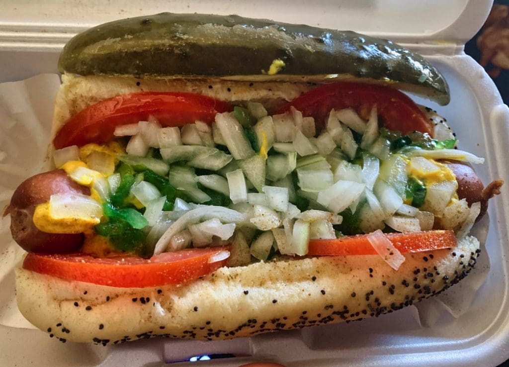 22 May 2020: Chicagoans lovingly refer to the Chicago hotdog as “dragged through the garden” because of the many accoutrements with which it is constructed: yellow mustard, chopped white onions, neon green sweet pickle relish, a dill pickle spear, tomato wedges, pickled sport peppers and a dash or two of celery salt on a poppy seed bun. Then there’s the Vienna Beef hot dog in a natural casing with its first-bite-snap. By the way, you should never say “Chicago style hot dog” because “style” implies Chicago’s hotdogs are a variation of an original. Both AK Deli and AK Pizza serve a Chicago hotdog as good as any you’ll find in the Windy City.