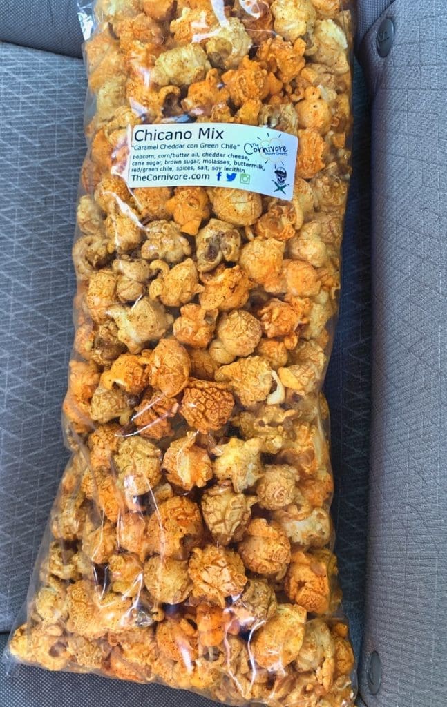 “Now. Let’s talk snacks. Let me introduce you to a popcorn place called The Cornivore. Their popcorn is made without the artificial junk you find in a lot of other brands. Since they’re a New Mexican company, green chile plays a prominent role in their flavors. Green Chile Butter, anyone? Their Chicago variety is known as the “Chicano” mix. See what they did there? It’s made even better by adding green chile. As it’s been said many times in this blog, green chile improves everything it touches!