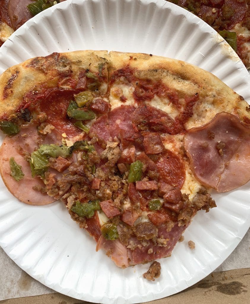 Though we missed out on enjoying the Southwest Burger at Hall of Flame, we were determined not to miss out on a pizza from Cafe Rio even if the Covid crisis changed the way we would experience it. We called our order in at 1PM and were instructed to pick it up at 3PM. From what we’d heard and read, even under “old normal” circumstances, finding a seat would have been a challenge. Cafe Rio is a Lilliputian lair with sparse seating. Long waits for one of the few tables is pretty standard.