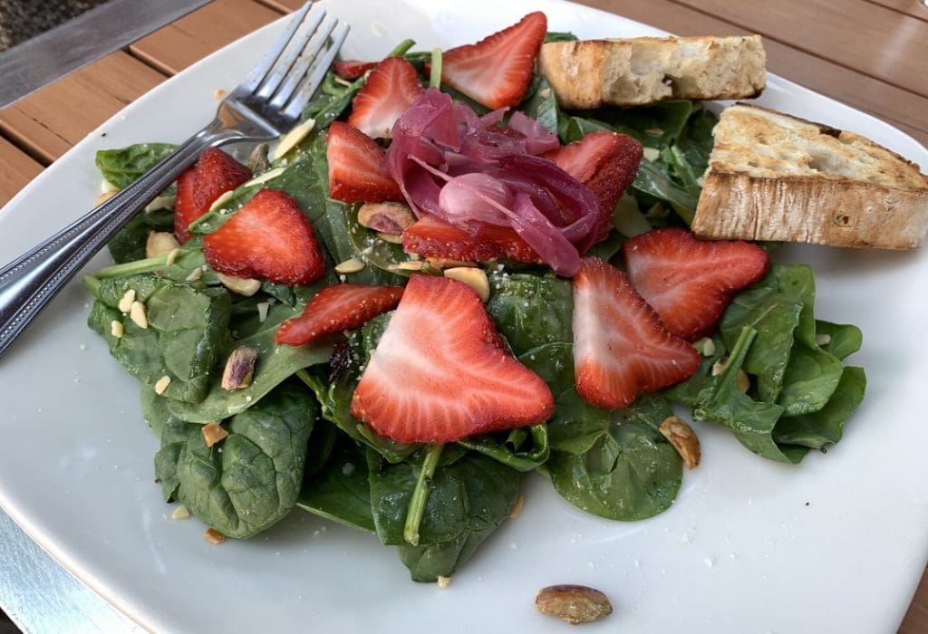 The book A Painter’s Kitchen: Recipes from the Kitchen of Georgia O’Keeffe highlight the legendary artist’s creativity in the kitchen where she took great pride in her healthy culinary style. O’Keeffe enjoyed both fruit and salad at noon and for her evening meal. In Cafe Abiquiu’s strawberry field green salad (New Mexico pistachios, roasted almonds, pickled onion, strawberries, Cotija and lemon vinaigrette), we enjoyed both. Every element of this salad was fresh and delicious with just enough dressing to accentuate the natural flavors of each item. We’d like to believe O’Keeffe would have enjoyed this salad.
