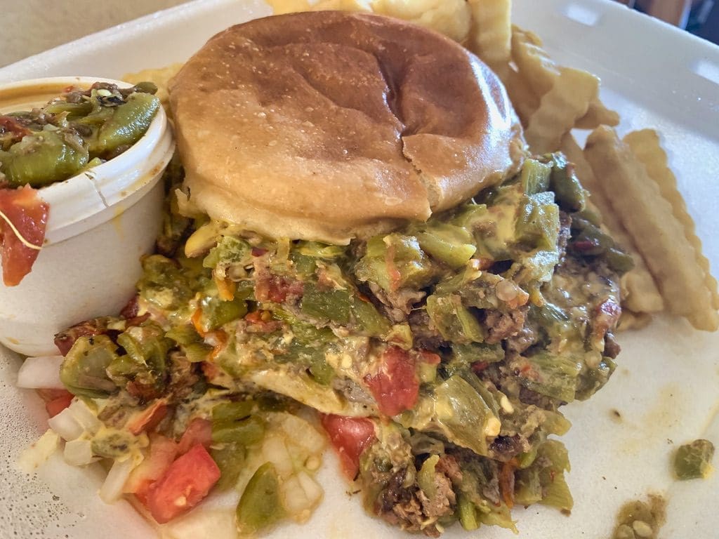 Lack of piquancy is certainly not an issue for the gorilla burger (double meat, double green chile, double cheese, onion, lettuce and tomato), a beefy behemoth made from a full half-pound of beef. It’s served with a large order of crinkled fries and for good measure, small containers of red and green chile on the side. Bursting beyond the confines of two hapless buns, this is a multi-napkin affair sure to find itself onto your wardrobe. You can’t pick it up without a quarter bushel of green chile spilling onto your hands. This is one of the biggest green chile cheeseburgers in the Land of Enchantment and it’s value priced ($7.80 as of July, 2020) among the cheapest.