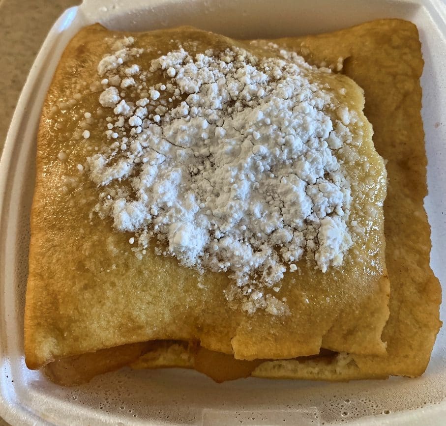 There are seven desserts on the menu including sopaipillas three ways: Stufy #5 (apple pie filling, cheese and powdered sugar), sugar sopas (powdered sugar or cinnamon sugar) and plain sopaipillas (one big or two small, depending on our day) served with honey the way New Mexicans love them. During our inaugural visit together, the only sopaipilla my Kim and I actually ordered was the Stufy #5, a sweet delight I remember having had several decades ago. In 2017, Gastro Obscura chronicled “the long, storied controversy over cheese on apple pie,” noting that “some love it, some hate it and some don’t know what it is.” Count me among those who love it so it stands to reason the Stufy #5 would be a huge hit with me. One nit, however…it could have used even more cheese.