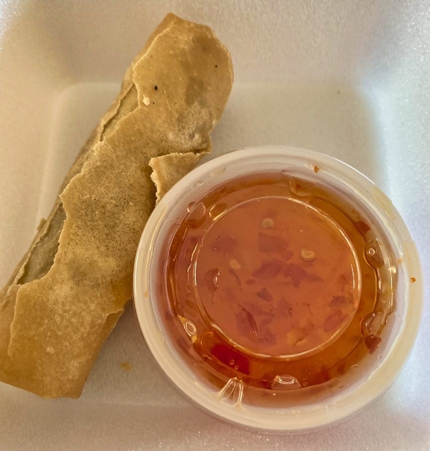 You might experience a bit of sticker shock as you peruse the menu. The most expensive item is just ten dollars as of July, 2020, but the true cheap eats are among the appetizers. Fried wontons are only fifty-cents each while egg rolls and fried shrimp are seventy-five-cents apiece. Interestingly, French fries, the only non-Asian item on the menu, go for three dollars. In addition to Vietnamese staples, you’ll also find such Chinese fare as chow mein and orange chicken. The only Thai offering is the ubiquitous pad Thai. The egg rolls might just have the thinnest, crispiest wrappers we’ve had, reminiscent of thin wafer cookies.