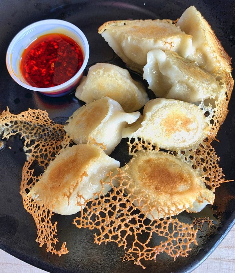25 July 2020: Pork scallion dumplings made for a much better appetizer. Get them fried instead of boiled and they’ll arrive at your table with a brittle umber tuile connecting all eight of them. Yes, each order rewards you with eight pork scallion dumplings. Best of all, they’re soup dumplings which means you’re well advised to exercise a bit of caution when you bite into them. Start by nibbling a corner, just enough so you can sip (not slurp up) the soup. That way it doesn’t scald your tongue Then you can eat the remainder. Both the pork and scallions are terrific. As with the green onion pancakes, the dumplings are served with a rather insipid chili oil.