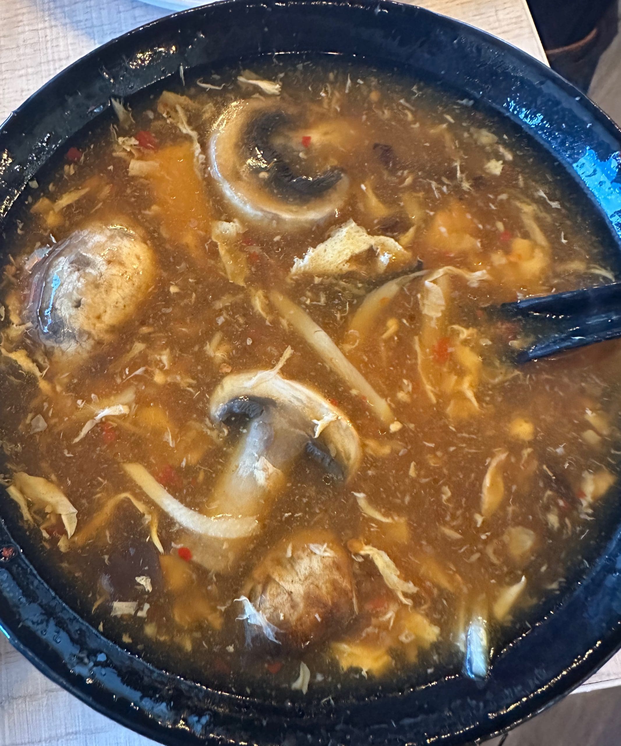 9 November 2024: Hot and sour soup along with egg drop soup are de rigueur offerings at most Chinese restaurants where a cup of one or the other is typically served with an entree on restaurant specials. The fact that hot and sour soup was posted on a board listing the day’s specials intrigued me. Just as intriguing was the listing of ingredients (edible tree fungus, bamboo shoots, mushrooms and tofu). If the notion of eating “tree fungus” even if prefaced by “edible” gives you a queasy stomach, you might opt for the more benign egg drop soup instead.