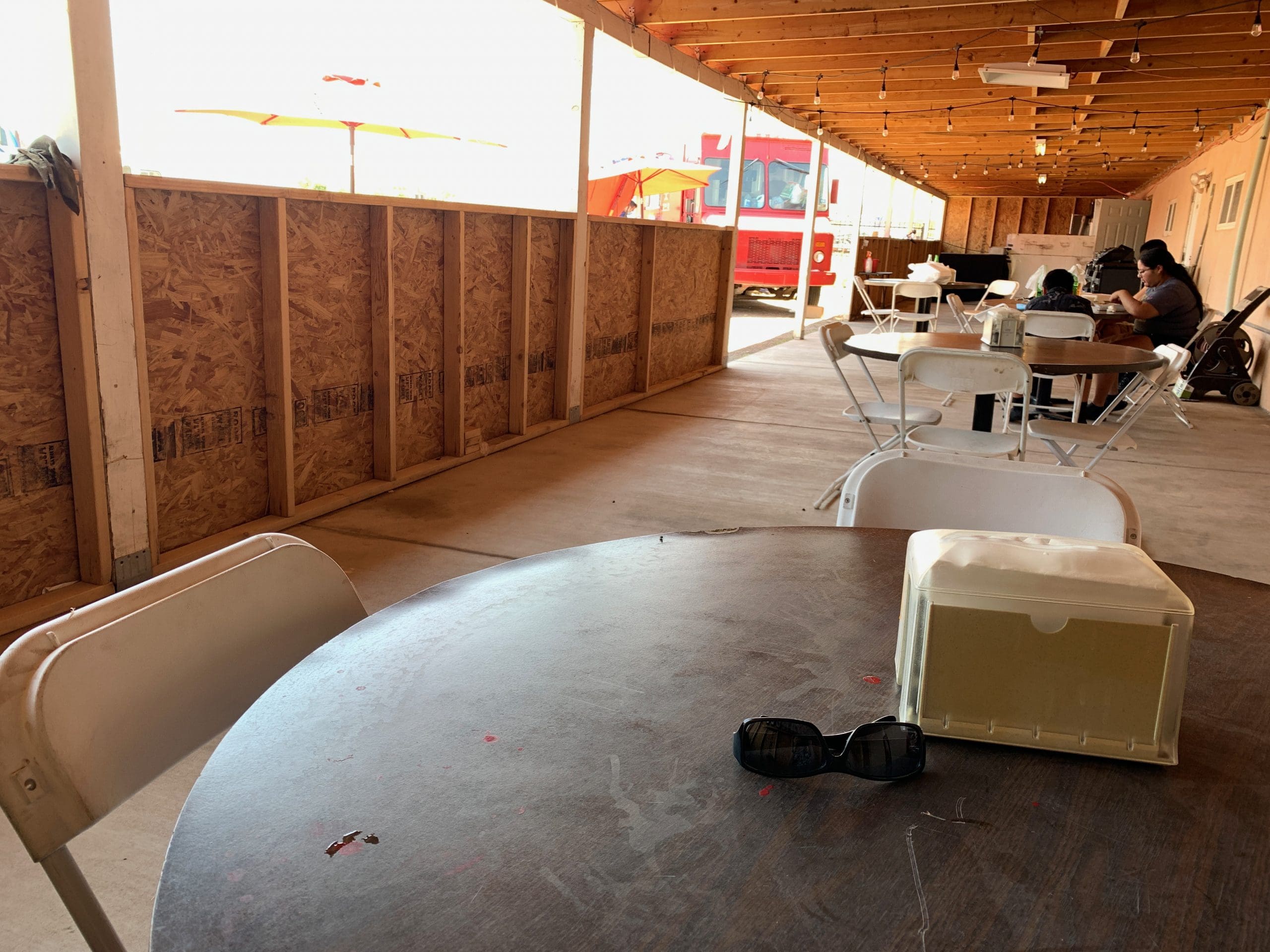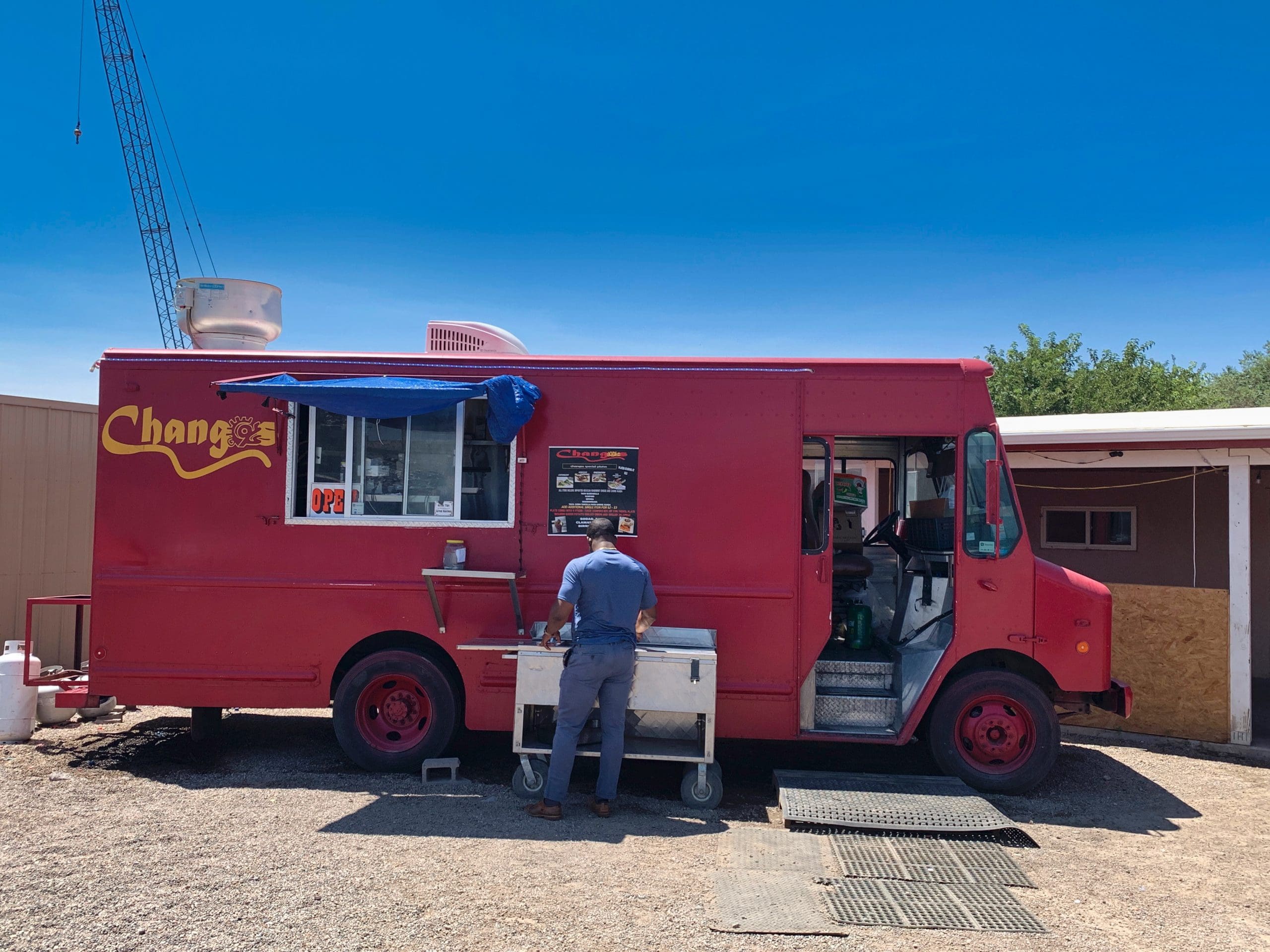 When we turned south off Rio Bravo and began wending our way southward toward Isleta Puebo, my Kim remarked “it had better be worth it.” I had asked her to be on the look-out for “Changos Food Plaza” (from its Messenger handle), picturing a small shopping center with a restaurant at its cynosure. Instead, we passed one gated compound after another, most of them fenced and industrial in nature. After overshooting the “Plaza” twice, Kim espied another gated compound, this one with a food truck parked up front We had arrived.