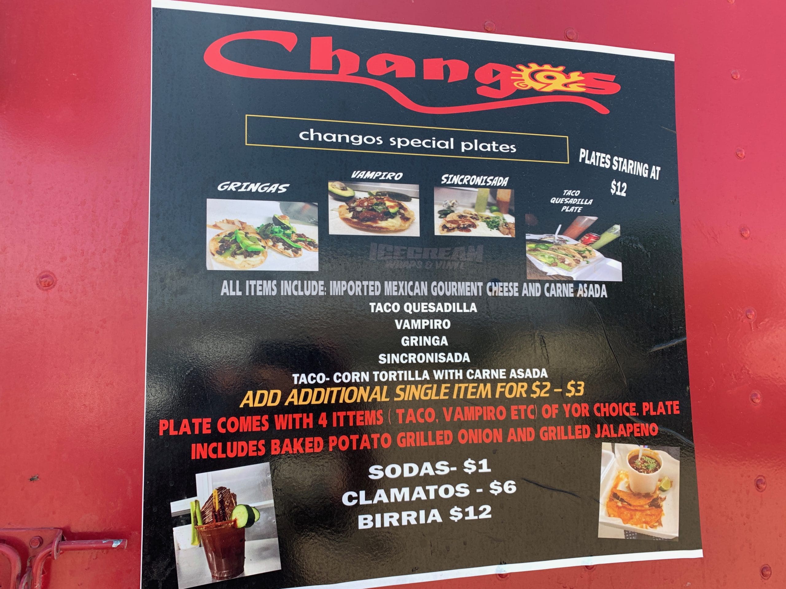 The Changos menu, posted by the food truck window where you place your order, is rather limited, listing such Sonoran and Sinaloan specialties as vampiros (comal-toasted tortilla topped with melted cheese and carne asada), gringas (flour tortilla taco typically stuffed with cheese, al pastor and pineapple), sincronisada (melted cheese, protein and ham, and sometimes vegetables sandwiched between two tortillas) and taco quesadillas (a best of both worlds cross between tacos and quesadillas). Also available are Clamatos (a Mexican cocktail) and birria (stewed lamb, beef or goat). The menu had me at birria.