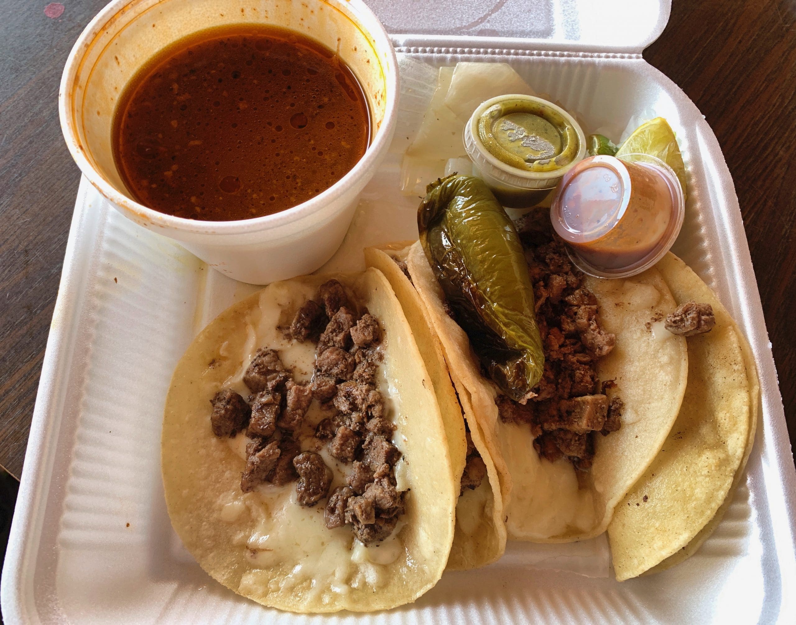 As with the gringas tacos, the queso Menonito was certainly welcome on the birriaquesadilla, a queso-rich taco with Sonora style birria. Lest I be remiss, make sure to order the “plate” which also includes grilled onions, a grilled jalapeno and (after 5PM) a baked potato. The birriaquesadilla plate also includes a bowl of birria consomé in which to dip your tacos or sup. While most birria is stewed meat served submerged in a seasoned sauce (this does describe the consomé), the birria tacos are made with beef cut up similar to the carne asada. It’s when we dipped the tacos that true birria flavor shone.