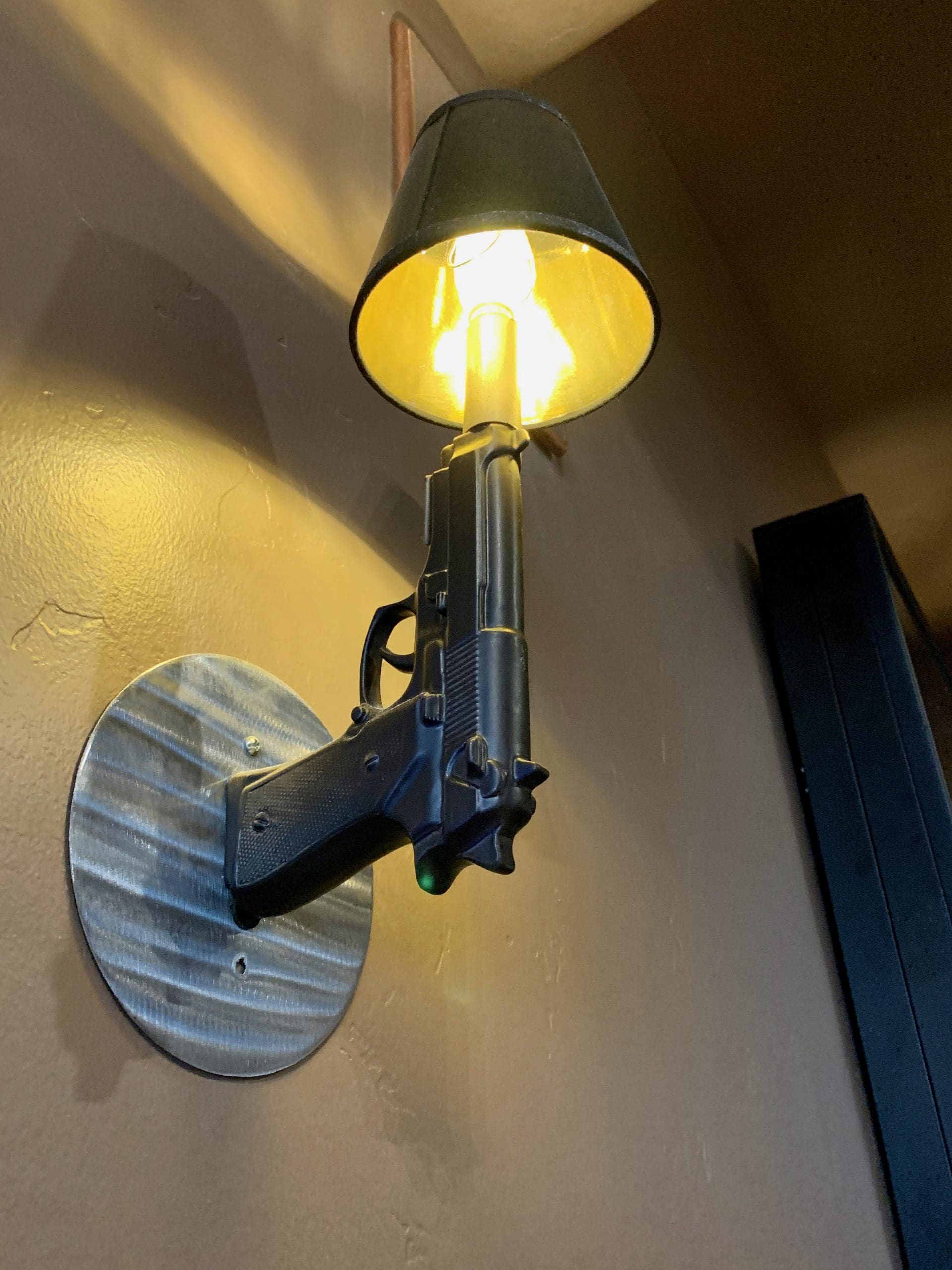 The Yacones commissioned much of the eye-catching artwork which adorns the restaurant’s walls. Some give you pause to reflect–such as a breathtaking quadriptych of the New York skyline threatened by ominous clouds. An inspiring triptych depicting an illuminated New York City’s Freedom Tower and its neighboring buildings hangs in the overflow room. It’s an amazing piece. Until Bob pointed them out, we hadn’t even noticed the decorative pistols used on the wall sconces. There’s something to see everywhere you turn at Forghedaboudit.