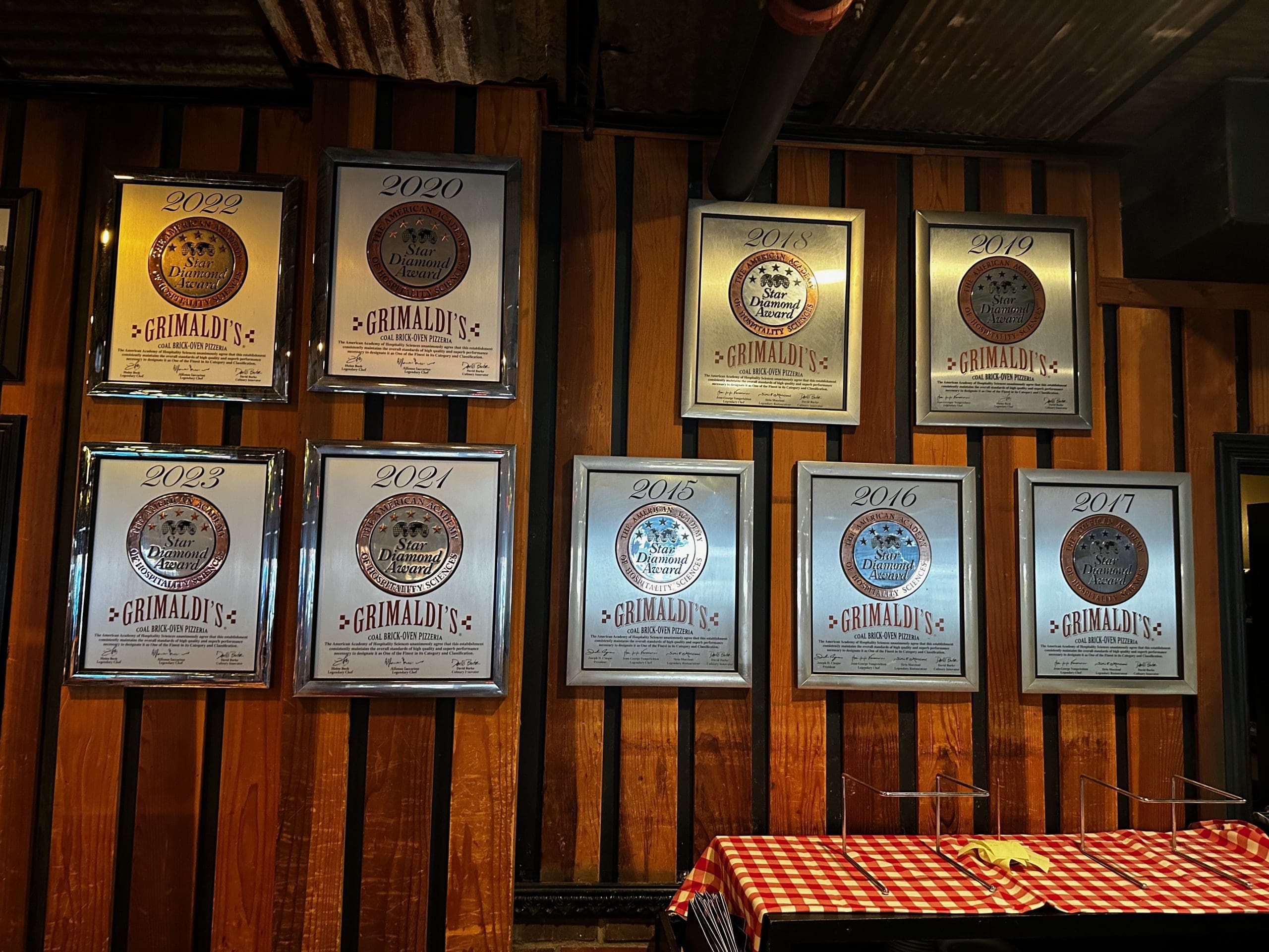 Grimaldi’s not only has history, but a legitimate claim to being among the country’s best purveyors of pizza. Zagat reviewers (the dining public) named its pizza the number one pizza in New York City from 1997 through 2003. City Search named it the best pizza in the country from 2001 through 2003. There are dozens, if not hundreds, such accolades. Several awards festoon the walls at the Scottsdale pizzeria in the heart of downtown. Grimaldi’s bakes my sister Anita’s favorite pizza in the valley. Her recommendation carries more weight with me than Zagat’s, Yelp or any of the other public sourced review sites.
