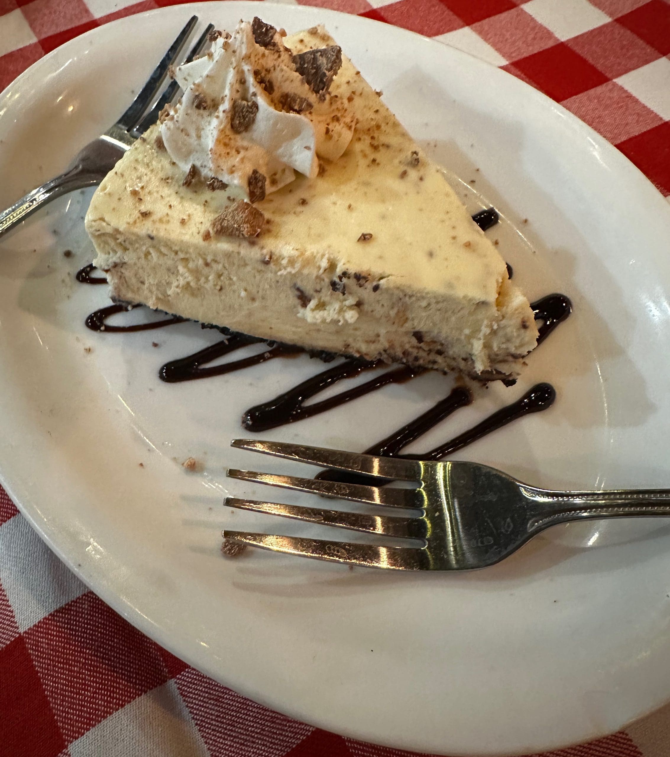 When the restaurant manager delivered our pizzas, he encouraged us not to fill up on pizza because Grimaldi’s was offering a seasonal dessert special–Reese’s Peanut Butter Cup Cheesecake (creamy vanilla cheesecake filled with chunks of Reese’s® Peanut Butter Cup, served with chocolate sauce and whipped cream). My Kim, infinitely smarter than her ravenous husband, heeded that sage advice and saved room. Me, I could manage only a couple of forkfuls. Available only two months a year, this is a special cheesecake–not only because it’s on special, but because it’s quite luxurious and delicious.