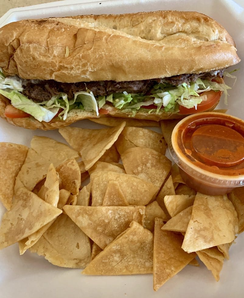 13 October 2020: Ever since Elotes Del Norte got me hooked on tortas de babacoa, they’ve become a veritable obsession, the first thing I look for on any menu at Mexican restaurants. Unlike most Mexican tortas which are constructed on either bolillo or telera bread, Ruby’s version is made on a more conventional sandwich roll. Other than that, it’s got the pretty standard fixings: lettuce, tomato, a smear of guacamole. The barbacoa isn’t quite as rich or generously seasoned as other barbacoa we’ve had, but it’s got plenty of flavor and makes for a delightful sandwich. Accompanying the torta are another form of tortillas, the fried and crispy triangular kind served with salsa.