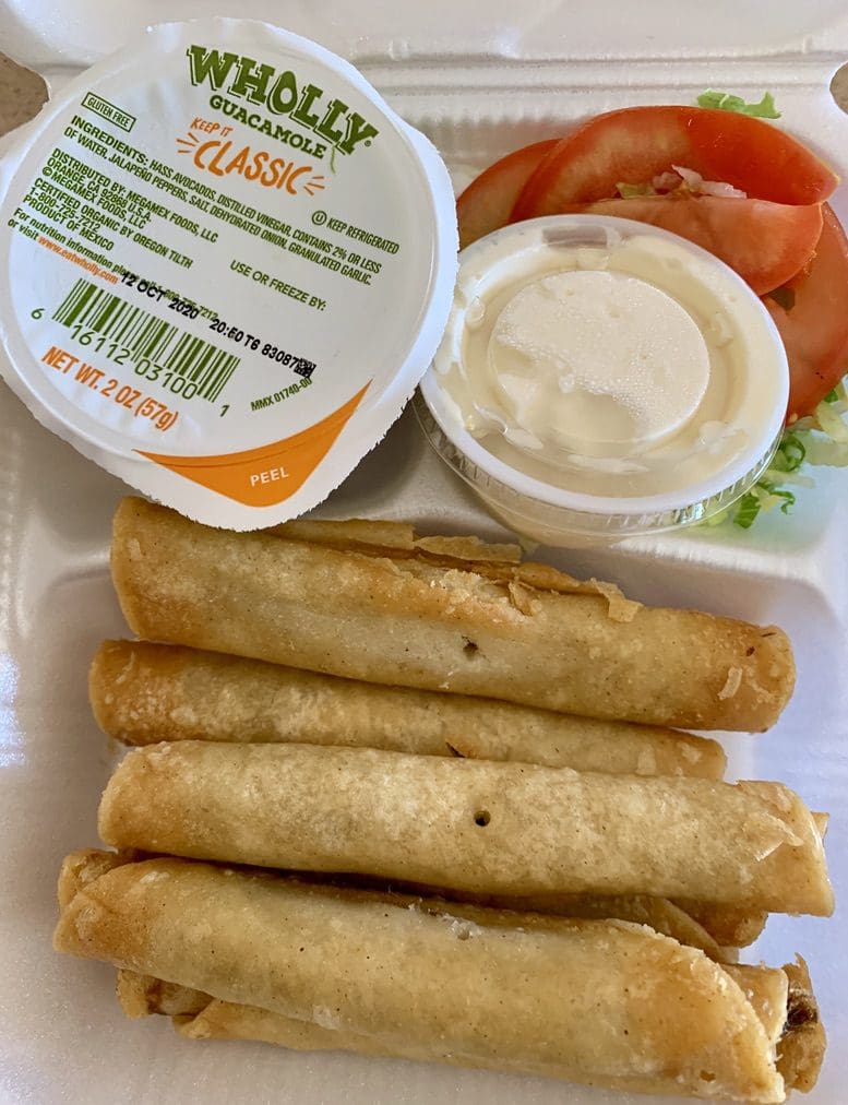 13 October 2020: Corn tortillas are front-and-center on the pork flautas, the cylindrical, deep-fried rolled tacos that derive their name from the Spanish word for flutes. Though some sources contend that the difference between flautas and taquitos is that flautas are made from flour tortillas. Not so at Ruby’s Tortilleria where the corn tortillas really shine with their delicious, pronounced corn flavor. The flautas are served with guacamole and sour cream, both of the “store bought” variety. Rather than dip the flautas in either the sour cream or guacamole, we enjoyed them with Ruby’s red and green salsas.