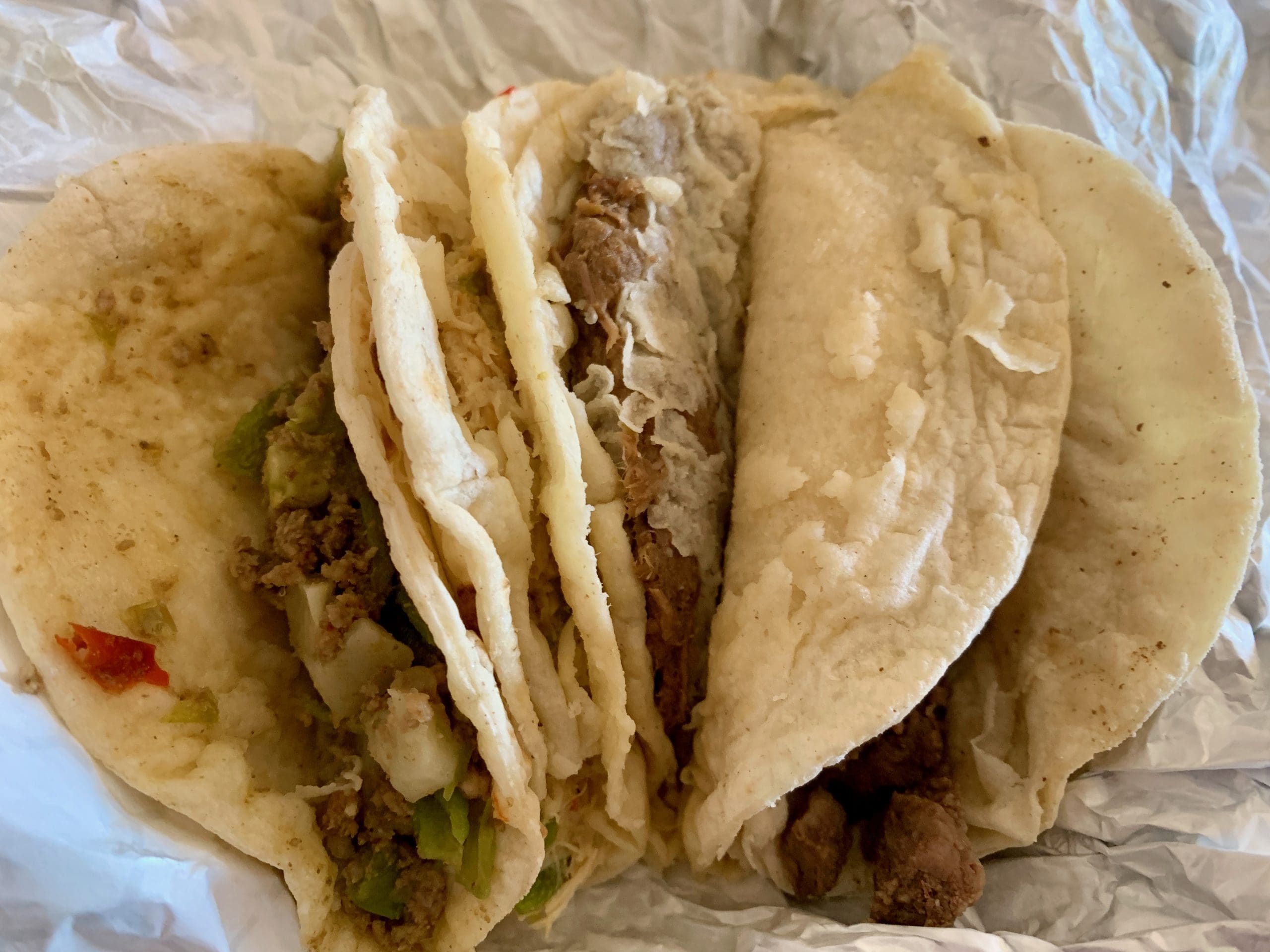 13 October 2020: Considering how much we enjoyed the corn tortillas, it didn’t come as a surprise that the tacos would be superb. We ordered four–carne asada, carne desebrada, pollo and barbados–of the six available tacos and regret not having ordered the other two (chicharron and picadillo). Snuggled within the comfy confines of the corn envelopes, the meats were kept warm for the entirety of our 15-minute ride home. Though steam didn’t waft upward when we released them from their wrapper, it was easy to imagine how much better they would have been had we eaten them in the car. These are most assuredly not New Mexico tacos. They’re not encumbered by shredded cheese, lettuce and chopped tomatoes. It’s strictly about the named meats though a side of cilantro and some fiery red and green salsas are provided. The best tacos are a balanced marriage of corn tortillas and what they’re engorged with. Sometimes less is best.