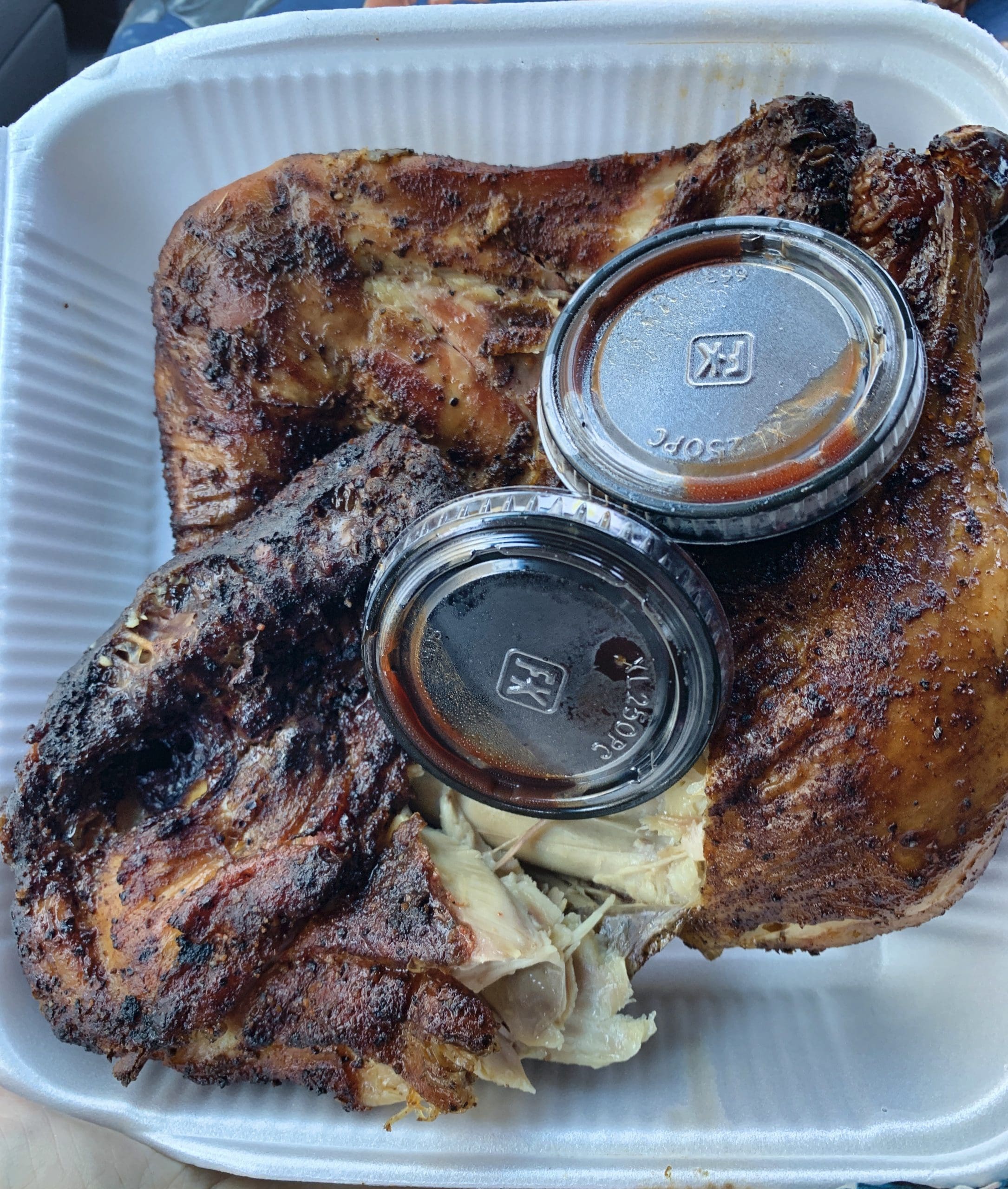 17 October 2020: Manuel may have made his reputation on brisket and ribs, but he can build an empire on the chicken quarters(drumstick and thigh). My Kim is the chicken aficionado in the family so when she insists these are the best in New Mexico (even better than Mighty Mike’s), who can argue. The chicken is melt-in-your-mouth moist and absolutely delicious with that light smoke flavor imbued by pecan wood. She enjoyed it both with and sans sauce, a sweet-tangy concoction you’d happily drink up.
