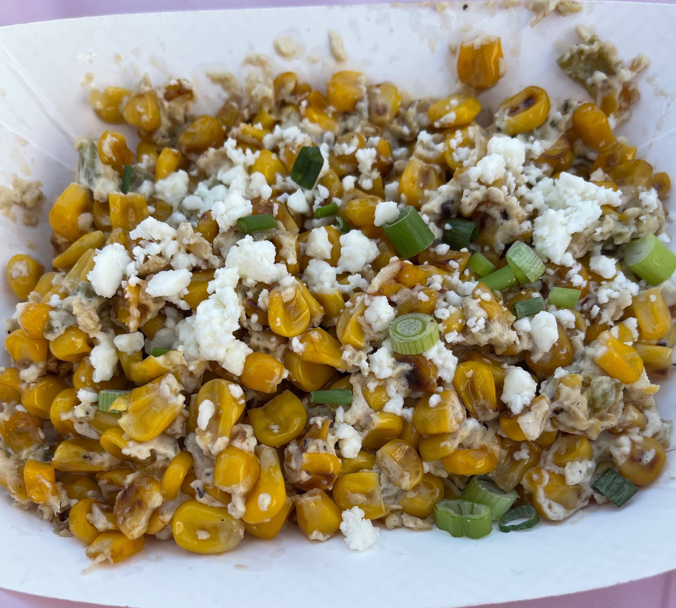 14 May 2022: Also new to the Rev’s menu is an elote bowl (roasted corn, cream cheese, green onions) to which you can add brisket or pulled pork. So that the focus of our dish would be the roasted corn, we opted not to add any of the Rev’s addictive smoked meats. If it seems we always order elotes in every form in which they’re available, your observation is spot on. We love elotes. It also seems the cheese most often used on elotes is cotija. Cotija is an excellent cheese to be sure, but we were intrigued by cream cheese. Somehow Manny and his beauteous bride figured out how to make cream cheese crumbly like feta. What a great find this was! The cream cheese takes these elotes to an elite level.