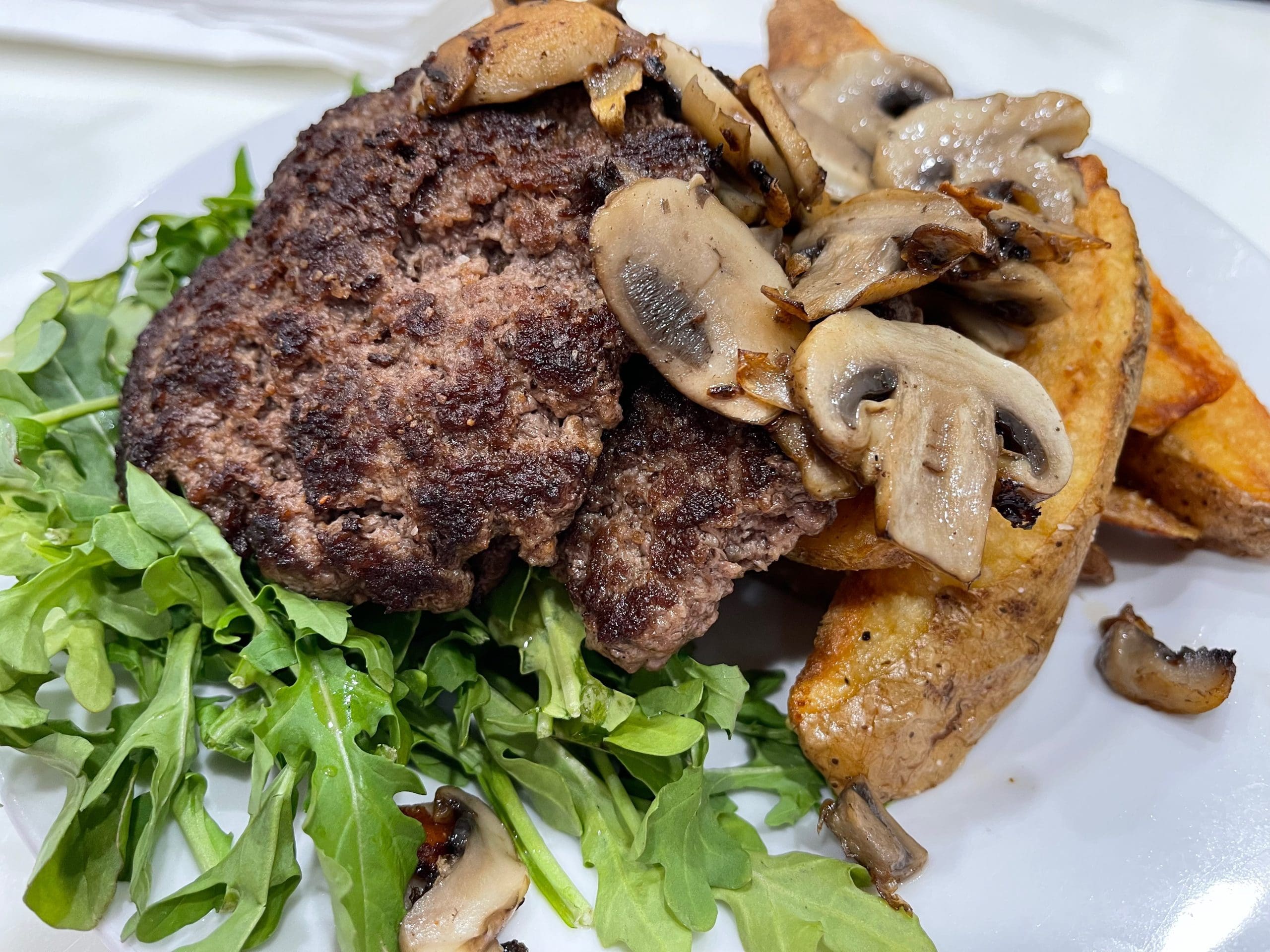 3 June 2022: For diners eschewing bread in favor of bread alternatives, one option (albeit not necessarily greatly reduced in calories) is the steak burger frites (two seared burger steaks, potato wedges, mushrooms, bacon onion jam, arugula, au jus). Just don’t make the mistake of confusing “burger steaks” with rib eye steaks, Porterhouse steaks or even prime rib. Burger steaks are thick, charred burger patties. And if you’re used to frites as thin as matchsticks, you’re in for a surprise. The potato wedges are Texas-sized, thick-cut and (probably) baked wedges of potato. A more pleasant surprise is the fresh mushrooms which impart even more umami to an umami-rich dish. There’s so much umami, in fact, that you might just want to ask for more bacon onion jam to cut through it.