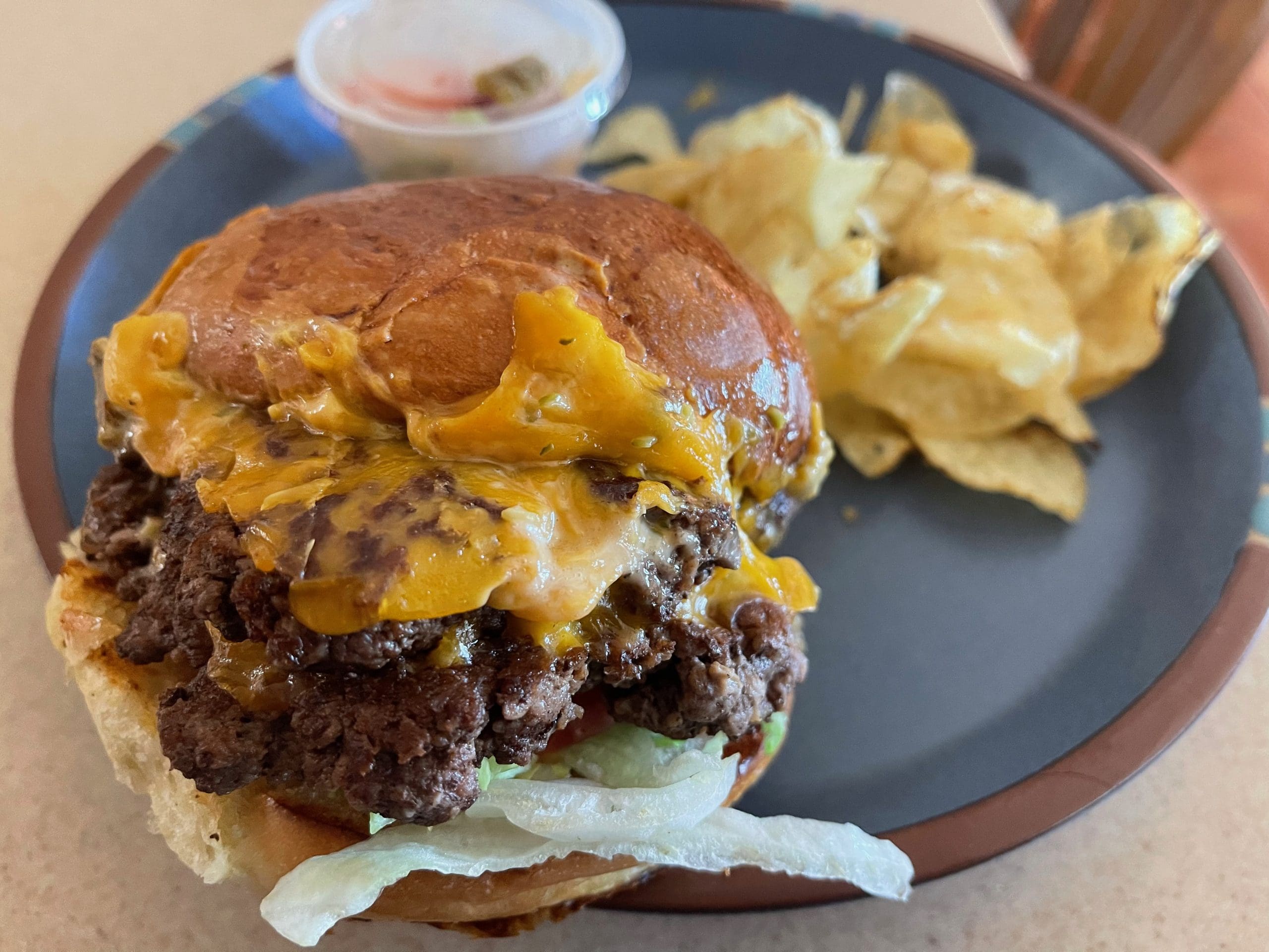 3 June 2022: One of the seven burgers categorized as “Upscale Burgers” is the Bistro Burger (braised short rib, burger patty, arugula, bell peppers, cheddar, muenster, au jus). Now, meat on meat isn’t for everyone, but if you identify with Clara Beller’s immortal utterance of “where’s the beef?” this burger is for you. Not only is the beef patty a behemoth, the portion of braised short rib is almost main entree generous. This is truly a carnivore’s dream though the richness of all that meat almost did me in. Good as it was, maybe some hot mustard would have helped cut the richness. The arugula and bell peppers did their best, but they were almost lost underneath all that protein. Then there are two cheeses (Cheddar, Muenster). It’s almost too much of too many good things.