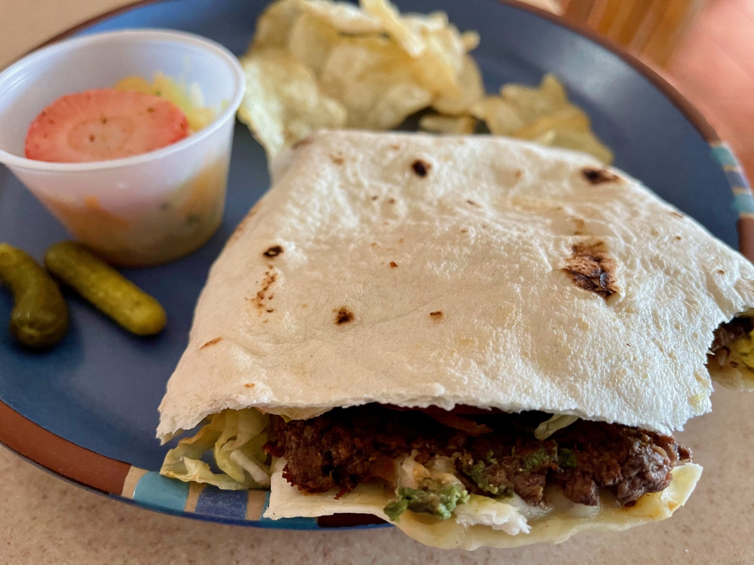 27 January 2021: Another way in which upscale or gourmet burgers are making their mark is by not subscribing to the age-old template that the canvas upon which to pile on other ingredients has got to be a hamburger bun. Hence the chipotle tortilla (tortilla, Muenster, avocado, chipotle aioli, jalapeño, tomato, iceberg, red onion and of course, the fresh in-house ground short-rib, sirloin and chuck blend patty). This is a burger replete with personality and flavors that go very well together. A few additional jalapeños would have made the burger even more to my liking, but not everybody is a fire-eater. As with the green chile double, the chipotle tortilla is accompanied by a rather good jicama melon slaw and kettle chips.