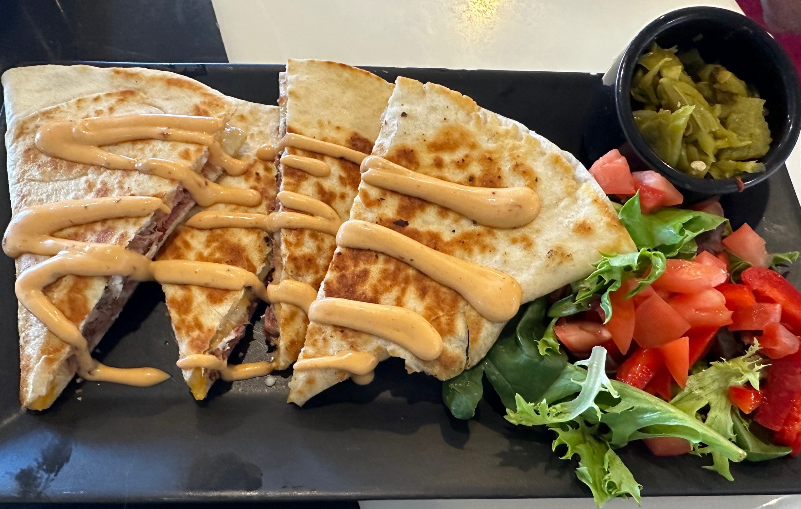 5 October 2024: One of many reasons finding Upscale Rio is worth the (small) effort is Nikki, one of the City of Vision’s very best servers. Nikki can be trusted to give you a savvy recommendation. She’s tried everything on the menu and is anxious for her guests to try them all. During our October, 2024 visit, for example, she recommended the short rib quesadilla (braised short-rib, cheddar and jack, green chile, chipotle aioli), four crispy wedges of deliciousness. The moist and juicy short rib is the star of this dish, but the supporting cast is equally stellar. Neither the green chile or chipotle aioli pack a piquant punch, but they rev up the quesadilla’s flavor. If there’s one nit, it’s that four shared slices isn’t quite enough. A pizza-sized version of this quesadilla might be enough.