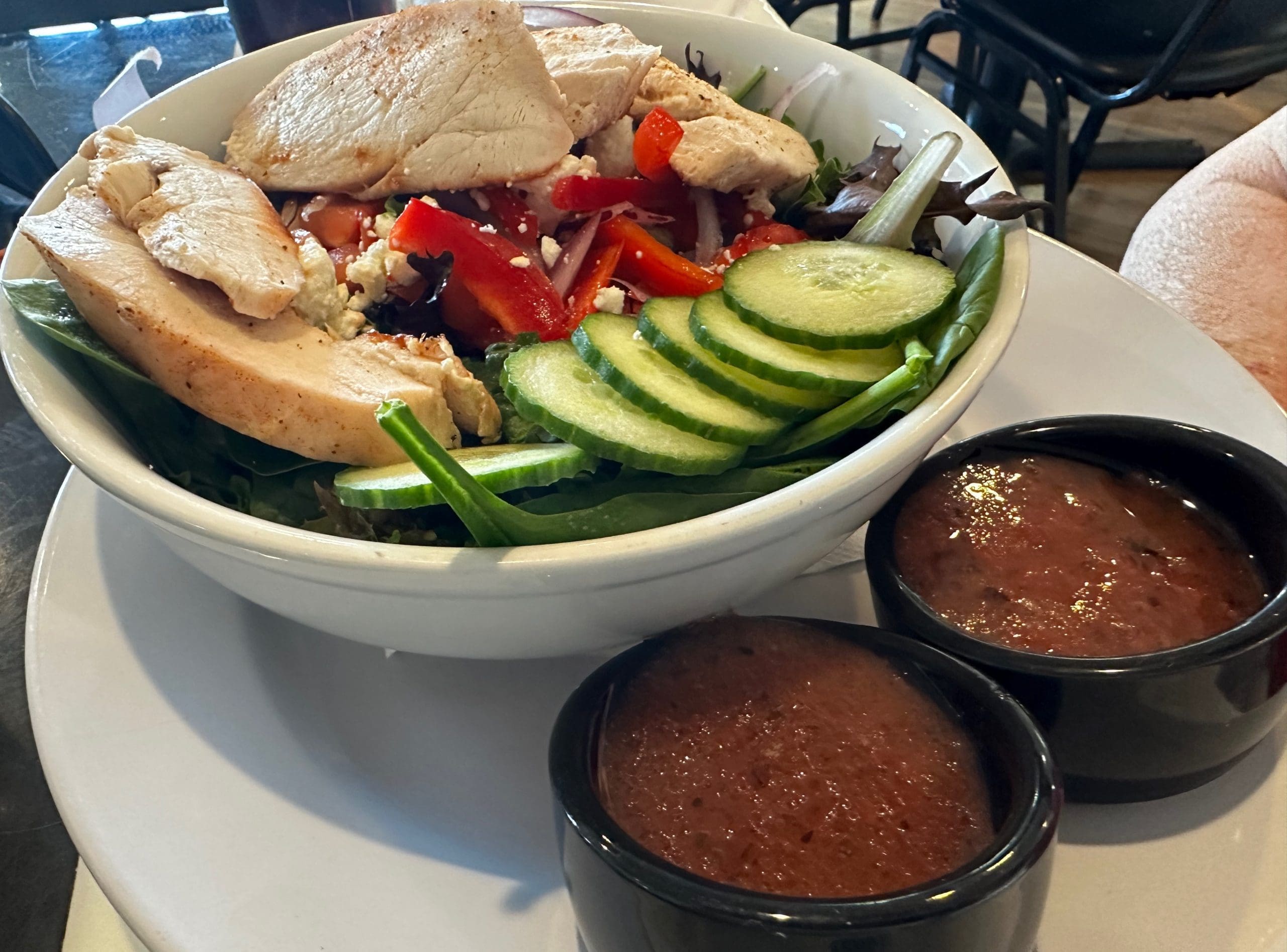 3 June 2022: Five salads–grilled chicken cobb salad, taco salad, house salad, strawberry and feta salad, and quinoa salad–adorn the menu, again priced reasonably. The taco salad is one of two items (the other is the carne adovada burger) in which cumin is used. When we ordered the strawberry and feta salad (grilled chicken, candied pecans, strawberries, feta, cucumber, tomato, greens) we reasoned it would serve as our appetizer. Instead, that salad could have served as our entrée–not my entrée or my Kim’s entrée but one we could split between us. We barely made a dent in it and took enough home for lunch the following day. Not only is it a sizeable salad, it’s super fresh and delicious. Where did Upscale find strawberries that sweet? Where did Upscale find greens so fresh? One caution–you might not want to pair blue cheese dressing with all the feta piled onto this salad unless you want to wreck your breath for a week.