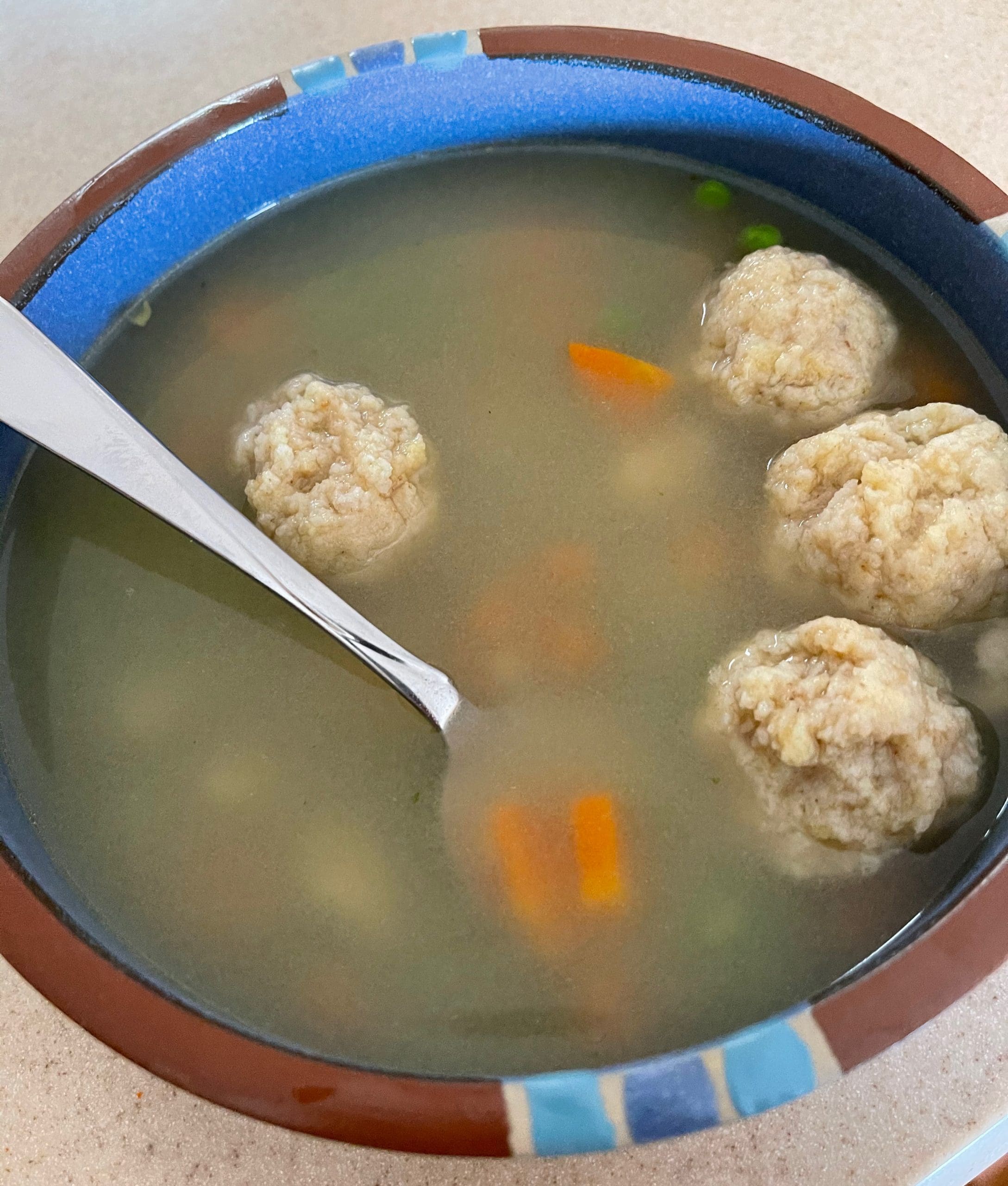 In a memorable Seinfeld soup episode, Seinfeld reluctantly agreed to take annoying hack comic Kenny Bania to Mendy’s restaurant for a meal in exchange for a suit Bania gave him. Bania ordered the consommé, then informs Jerry that this doesn’t count as payback for the suit because “soup’s not a meal.” Elaine agreed with Bania, arguing that heartier soups like mushroom barley, chicken gumbo, or matzoh ball might count as a meal, but consommé does not. After thoroughly enjoying Ruthie’s matzo ball soup, we’re inclined to agree with Elaine–matzo ball soup is a meal, a nutritious, hearty and delicious meal. The matzo balls themselves were about the size of a large marble and there were several of them in each serving as well as fresh peas and carrots.