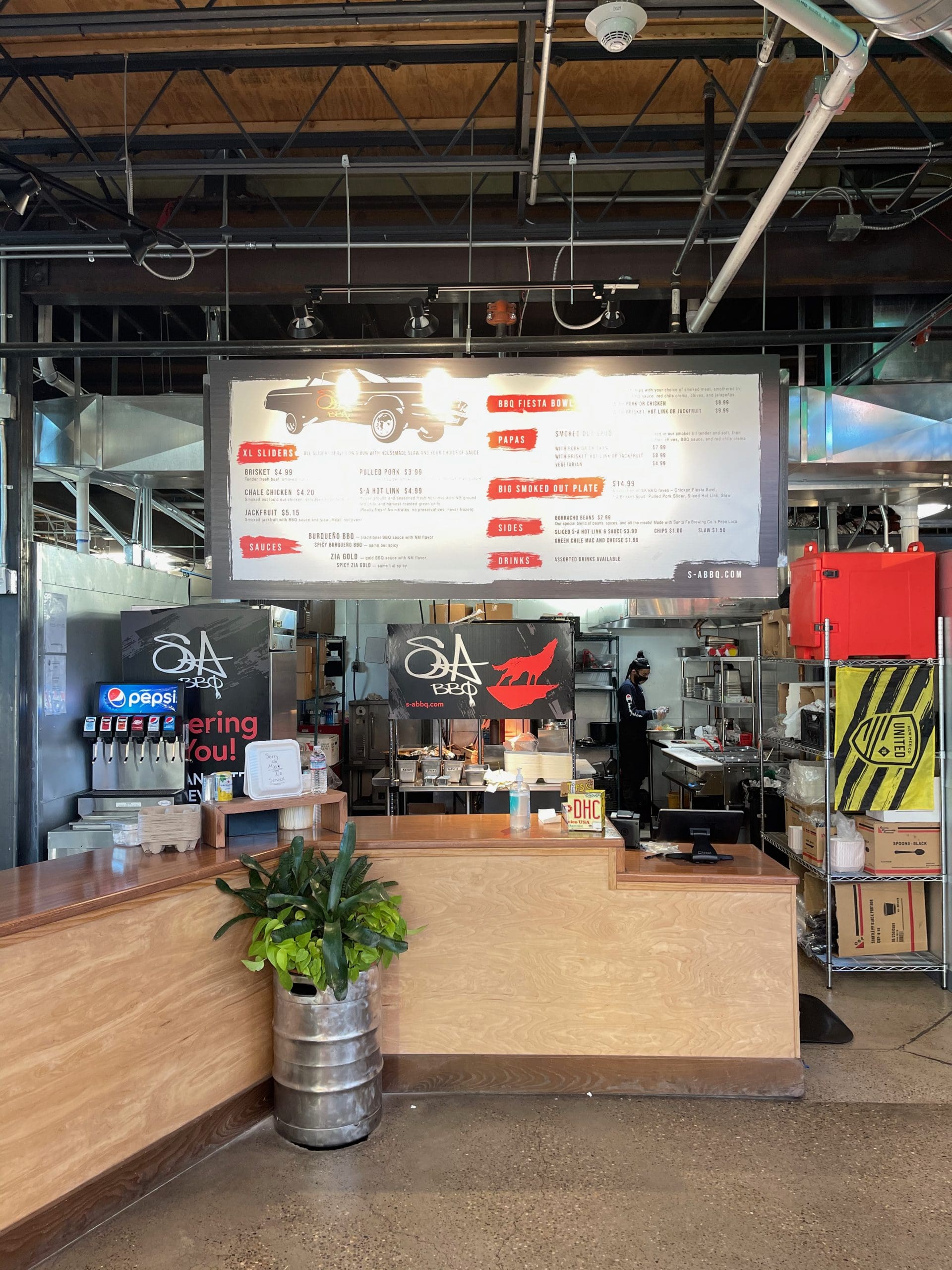 S-A BBQ’s website is an enticing invitation, apprising guests that “Our barbecue is smoked out low and slow. New Mexico-style BBQ means we pay tribute to traditional barbecue styles — but done our way. Our ABQ BBQ menu is lean and focused. Just a few items, all smoked to perfection. Our housemade sauces and spice rubs aren’t like anything you’ll find anywhere else. They’re made from true NM ingredients, blended to balance out the smokiness of the meat, and to add as much kick as you want. We offer a focused menu specializing in a few good meats: brisket, pulled pork, chicken, and hot links.”