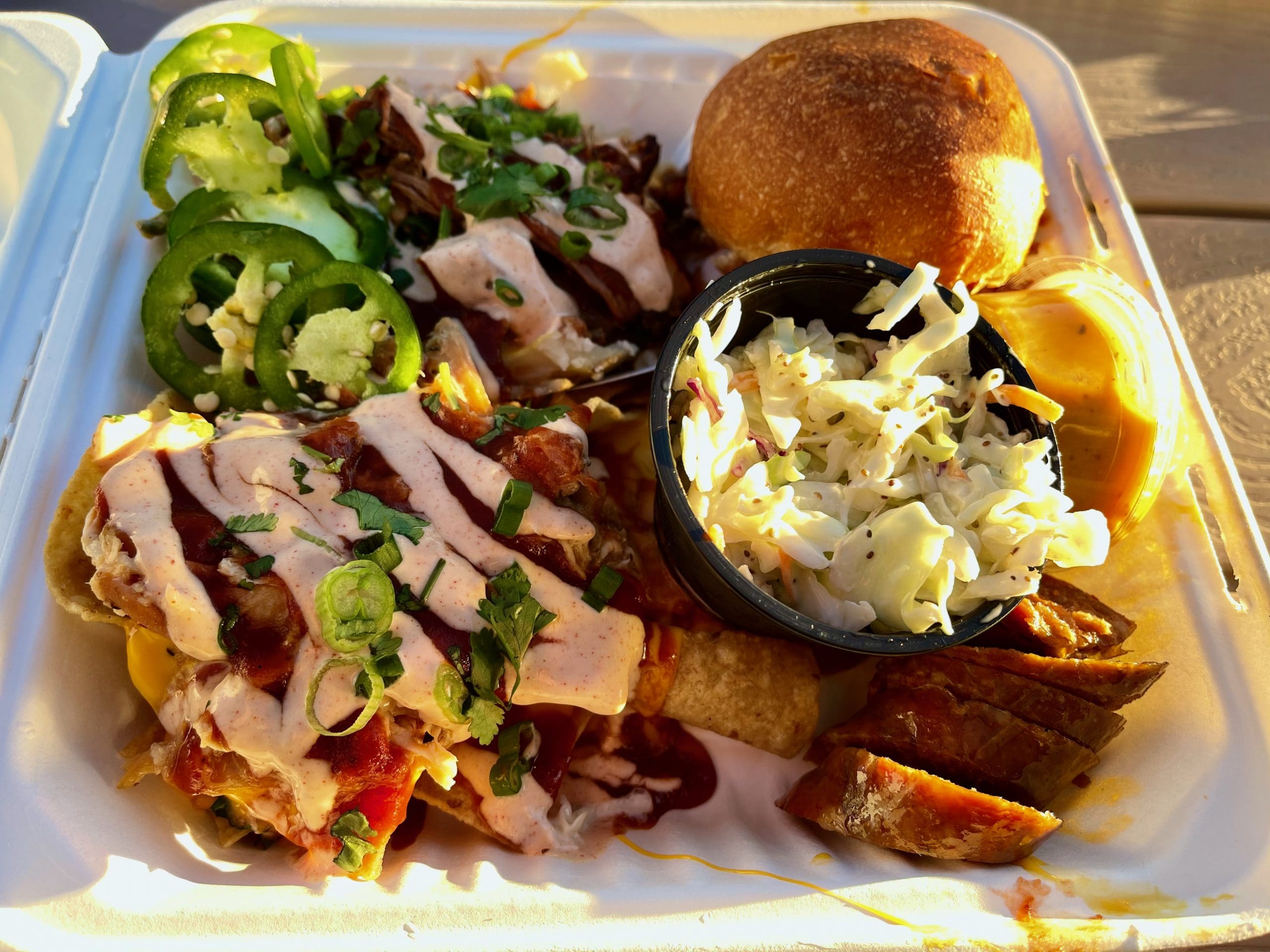 If you’re not sure what to order, do what Howie and I did and order it all. For only fifteen bucks, order the Big Smoked Out Plate which has a little of everything–and by “everything” that means: a chicken fiesta bowl, half brisket spud, pulled pork slider, sliced S-A hot link, and slaw. It’s as if S-A designed the plate just for guys like Howie and me who literally have lust in our hearts for all things barbecue. The Styrofoam container literally strains at the weight of the five item smorgasbord. Not all of it is good. Most of it is great!