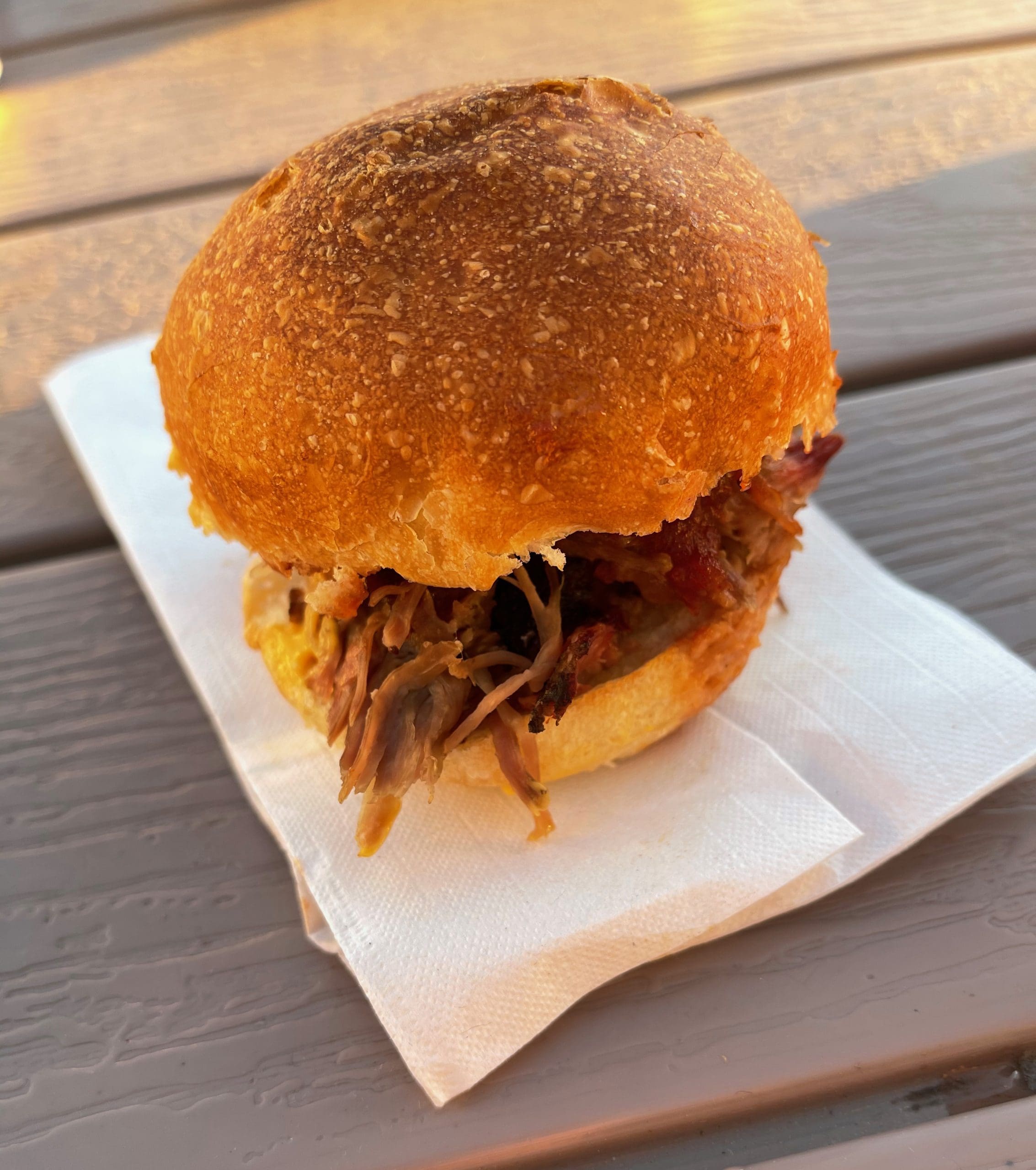 Wondrous caramelized crusty bark is always most evident and present in sliced barbecue. On S-A BBQ’s Big Smoked Out Plate the half-brisket spud and brisket slider the brisket is in shards, shredded and tender tendrils of pulled beef and it’s delicious.