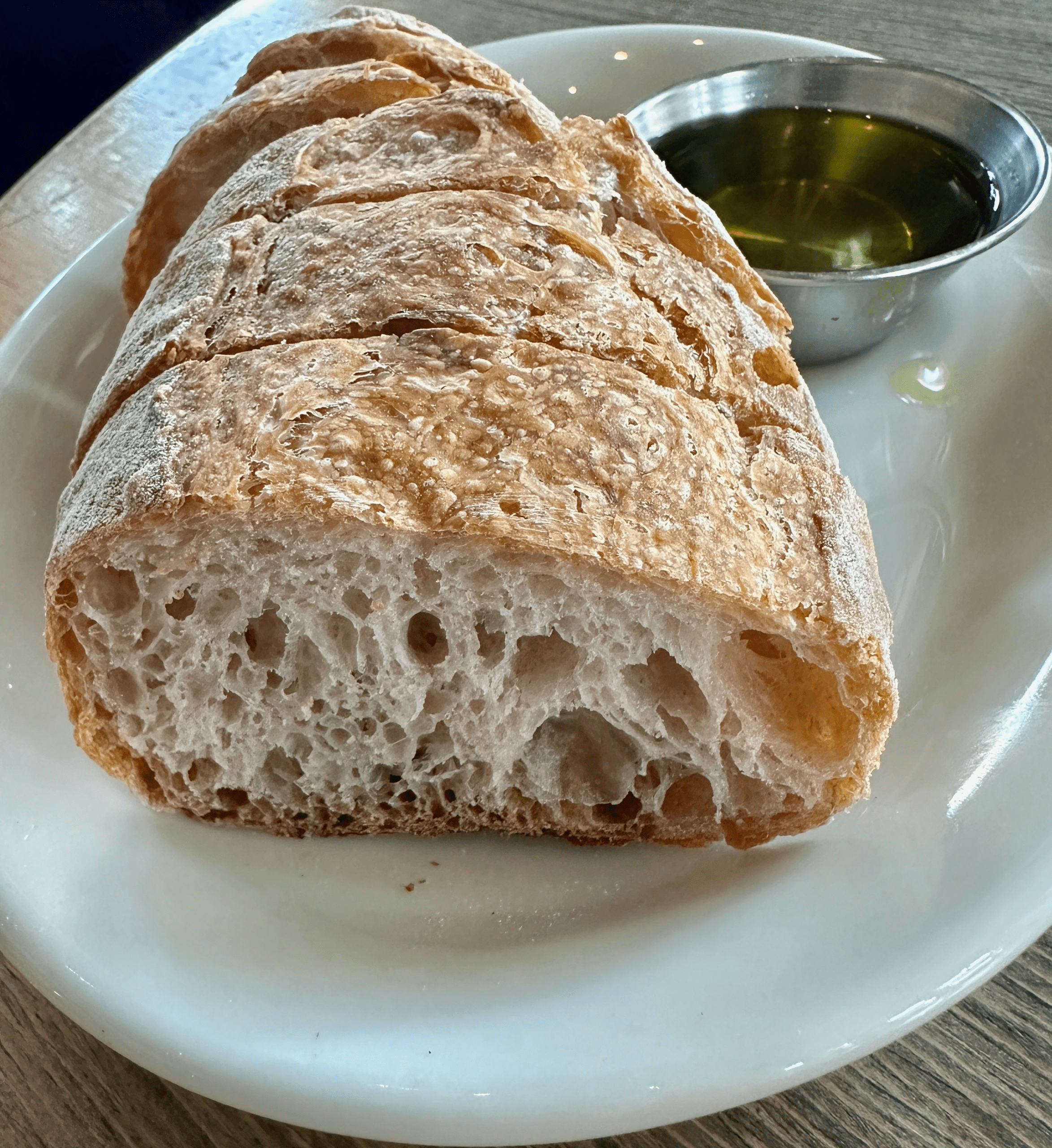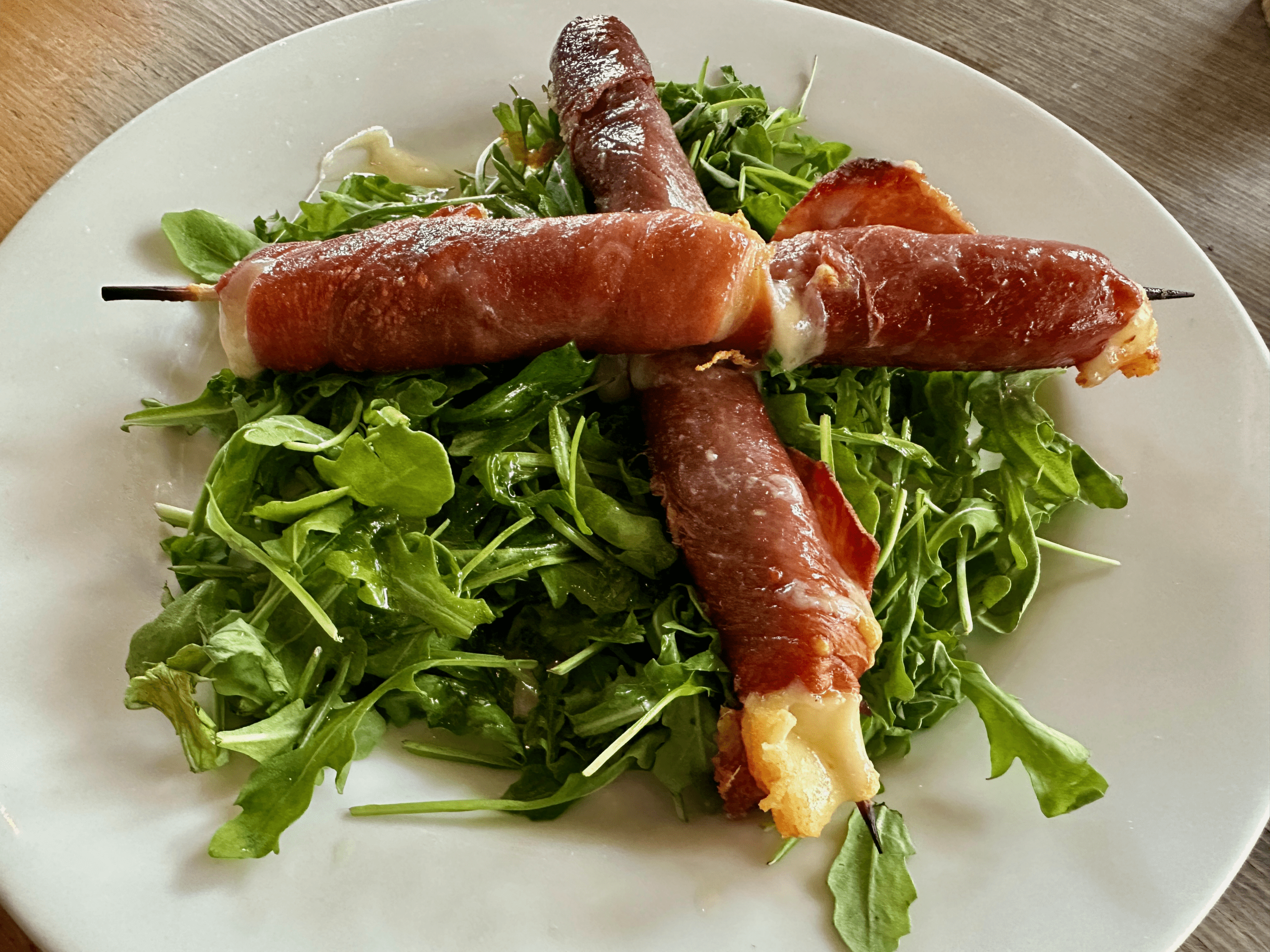 My disappointment started with an appetizer called speidini in which skewers of Prosciutto de Parma are wrapped around Italian Fontina (a straw-colored Italian cheese with a soft flesh and a mild, delicate flavor) and served warm. It was much too salty for my taste, a consequence of very strong (and very authentic) prosciutto. This antecedent to my pizza was accompanied by a wonderful crusty bread served with extra virgin olive oil. 6 January 2026: My taste buds may have changed between the years 2002 and 2025. That’s one explanation for how much I enjoyed the speidini the second time I had it. Admittedly, my Kim and I took our time between bites, allowing the salty and rich notes to wash over us. Speidini is outstanding, the essence of wood-fired smoke making sweet love to superb ingredients.
