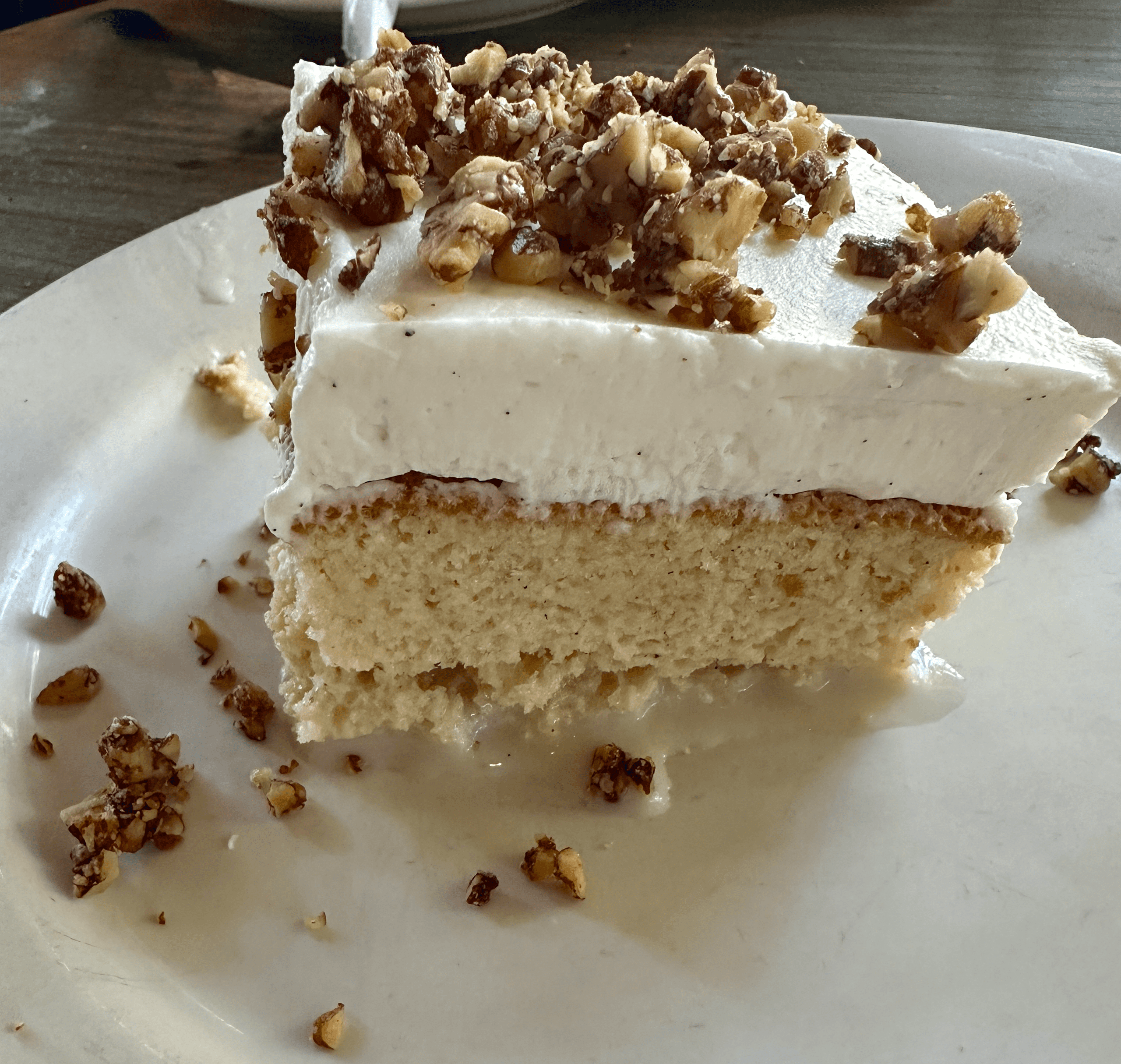 6 January 2026: Our server was almost as disappointed as we were that Pizzeria Bianco doesn’t offer any wood-smoked desserts. The reason, Marcos explained, is that the oven is almost always at capacity. Whether smoking mozzarella, baking pizza or firing onions, the oven is fully occupied at all times. Not to fret. Pizzeria Bianco, an Italian restaurant, serves some of the best tres leches cake, a Mexican dessert we’ve ever had. Its moistness was apparent even before the press of a fork. It positively oozed the three milks which give this confection its name. A thick layer of creamy frosting punctuated by pecans was as wonderful as the magnificent milky cake.