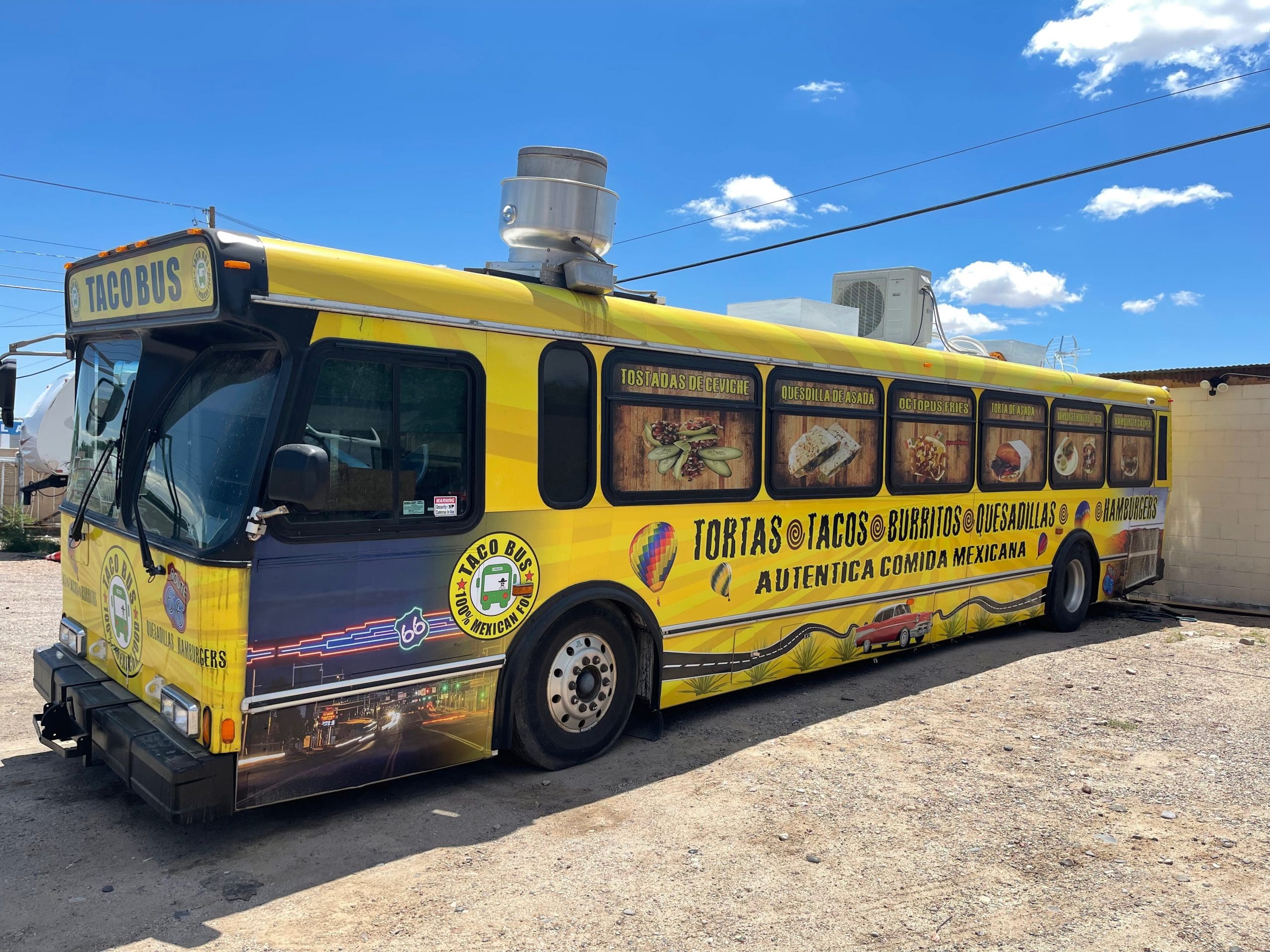 The Taco Bus menu isn’t as limited as the motorized conveyance’s small cooking space might have you believe. Essentially you can have burritos, tacos, quesadillas and tortas stuffed with your choice of asada, adovada, al pastor, cabeza, tripas, barbacoa and birria de chiva (goat). Also available are a number of super burgers topped with everything but the kitchen stove. You also won’t want to miss the “octopus fries” or the ceviche. Mexican soft drinks are available to quell the fire on your tongue from some of the salsas.