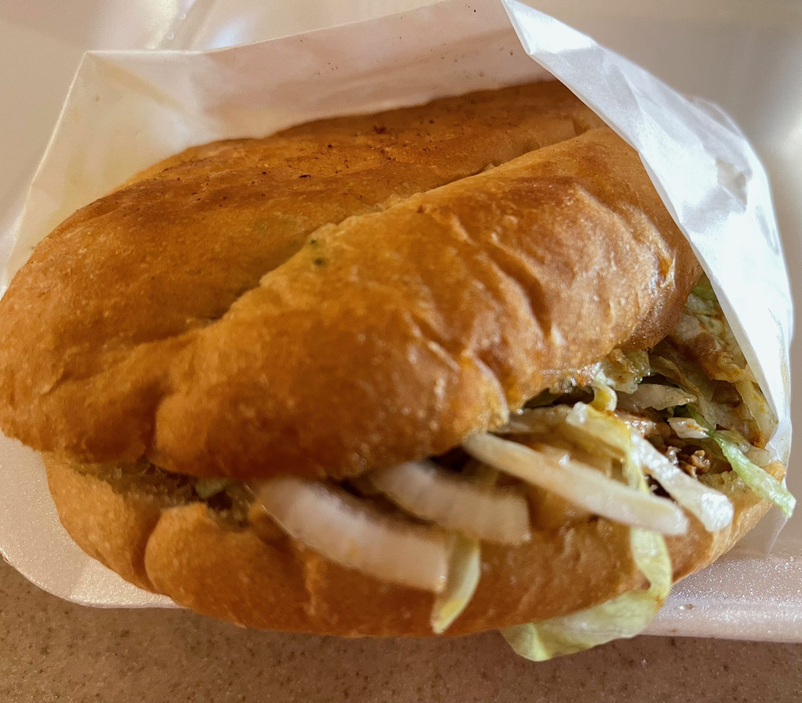 It certainly won’t surprise regular readers that my inaugural meal at The Taco Bus would include a torta de barbacoa de borrega (lamb barbacoa) my very favorite torta. Lately it seems most restaurants offering barbacoa make it with beef. That’s perfectly acceptable, but lamb is the preferred red meat in Mexico. Tortas are overstuffed with tomatoes, avocadoes, fresh beans, lettuce, beans and mayo within a cloud-soft telera bread. The bread is hard-pressed to hold in all those moist ingredients so you might want to be packing a fork on the side to pick up all the detritus. Good as the barbacoa itself is, the plentitude of other ingredients somewhat obfuscates the wondrous flavor of the barbacoa.