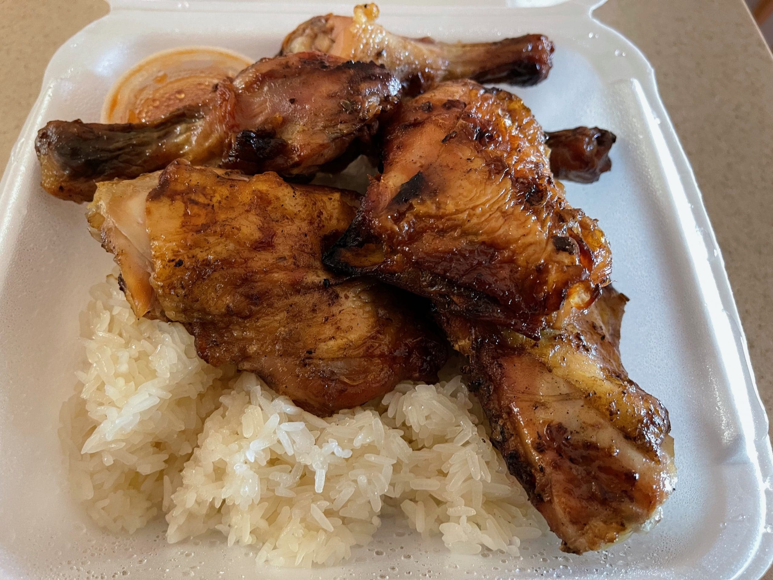 There didn’t seem to be much difference between the three-quarter legs plate my Kim ordered and my order of two-quarter lemongrass chicken (two legs and two thighs). We literally couldn’t discern any difference in flavor until I doused mine with all the spicy sauce. Still, on a “do-over” one of us would have ordered the boneless honey-glazed chicken. Oh well, that’s what second visits are for.