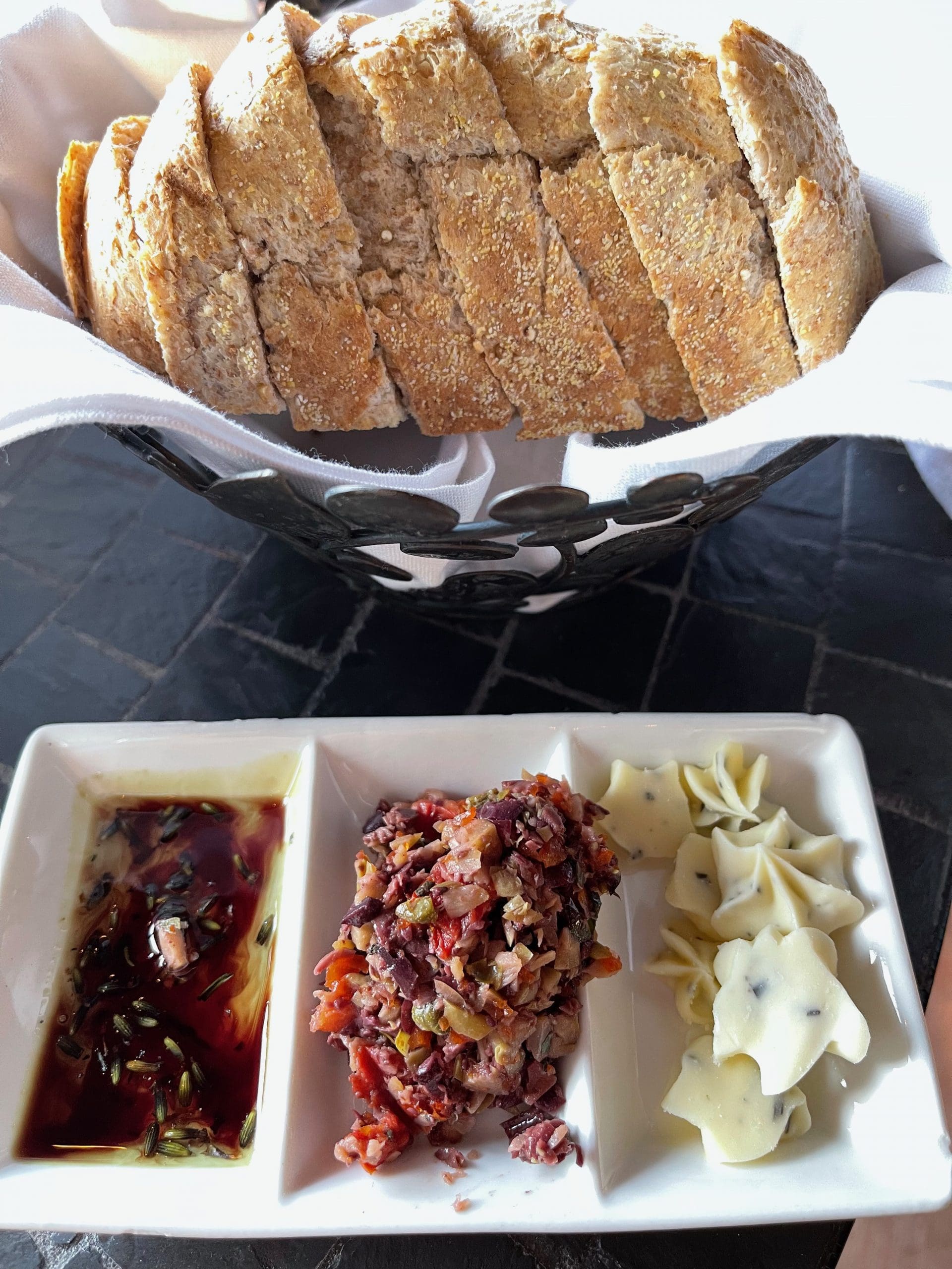 We did expect to be blown away by the Desert Bistro’s fabulous homemade bread. Every review we had read was effusive in its praise for that bread, a honey whole wheat bread served with three delightful accompaniments––a rosemary honey butter, olive tapenade, and combination of lavender canola and pumpkin seed oils with fresh lavender atop. All three were magnificent, with the butter being our favorite. Though the sculpted rosemary honey butter was served cold, it melted quickly into the warm bread. It took tremendous restraint not to gobble the entire loaf, but we didn’t want to fill up before enjoying the rest of what promised to be a superb meal.