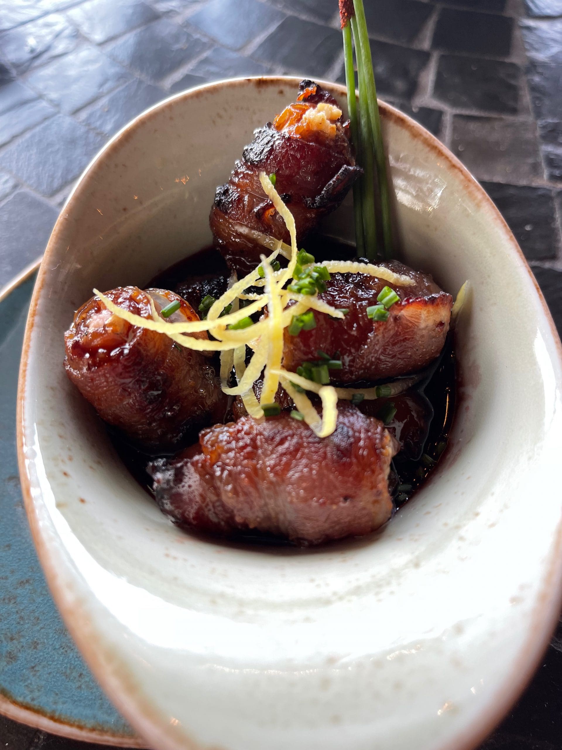 We’ve been on a dates kick ever since a May, 2021 visit to Mas Tapas Y Vino where über chef Marc Quiñones enthralled us with a dates plate that demonstrated a higher state of deliciousness. As someone with an aversion to overly sweet fruits, combining dates with savory ingredients has made a believer out of me. Similar to the dates at Mas Tapas Y Vino, the pairing of sweet and savory flavors on Desert Bistro’s baked bacon-wrapped dates (stuffed with chèvre and drizzled with pomegranate molasses) was an absolute winner. Bridget advised us to drench the dates into the coffee laced pomegranate molasses at the bottom of the plate. Great advice! Each bacon-wrapped date was like a nugget of pure gold, like a meat candy we couldn’t put down.