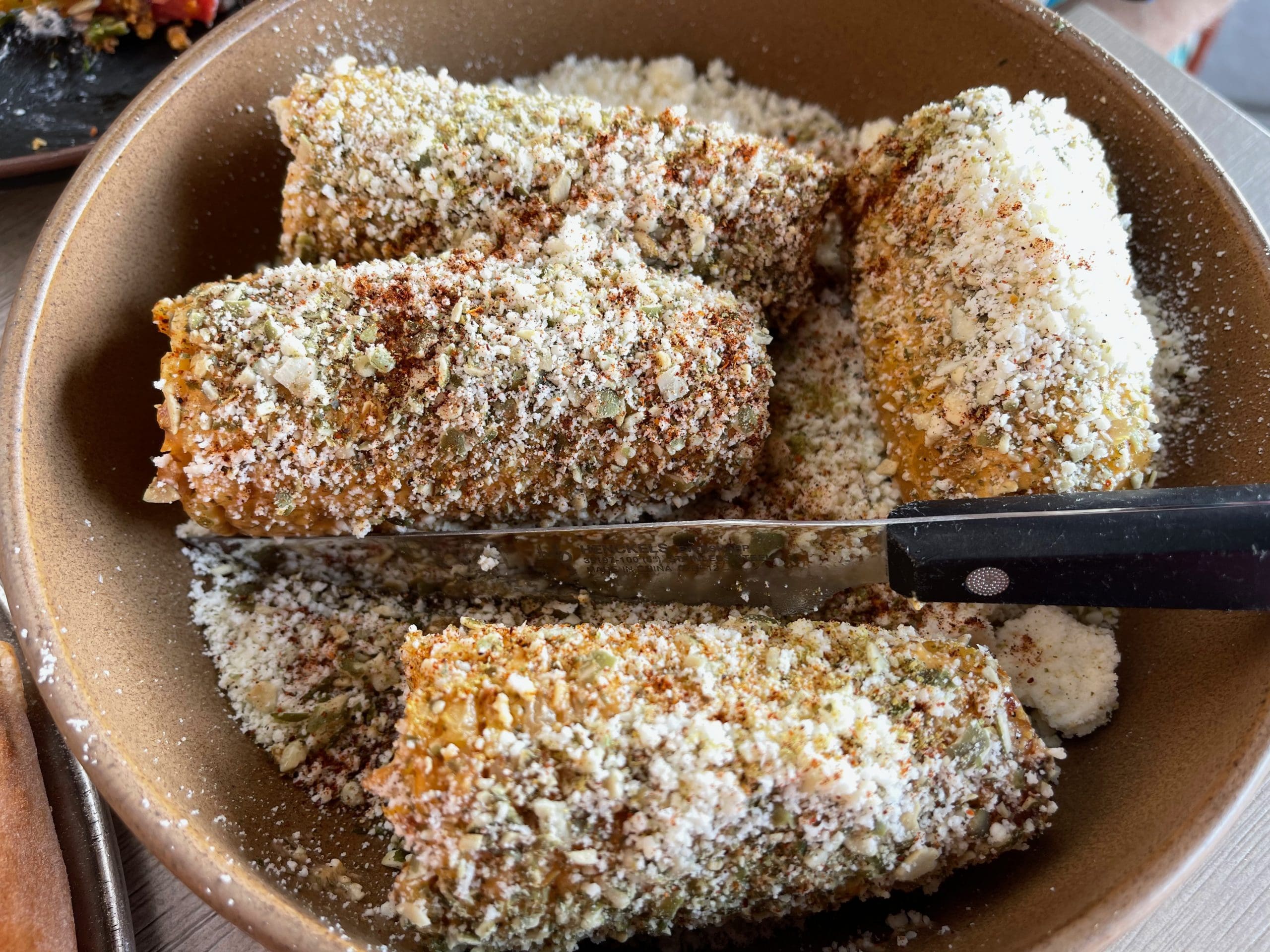 Habitues of Gil’s Thrilling… are well acquainted with my reverence for elotes, grilled Mexican street corn. The Nomad East equivalent is called simply oven-roasted corn (crema, cotija, toasted pepotas (SIC), Serrano powder). By any other name, this shareable plate of four roasted corn cob halves is surprisingly good. At first glance the corn looks like the recipient of a Wasach snowfall so generously is the cotija heaped on. Maybe the profusion of powdered fromage is designed to quell the sweltering heat of the Serrano powder.