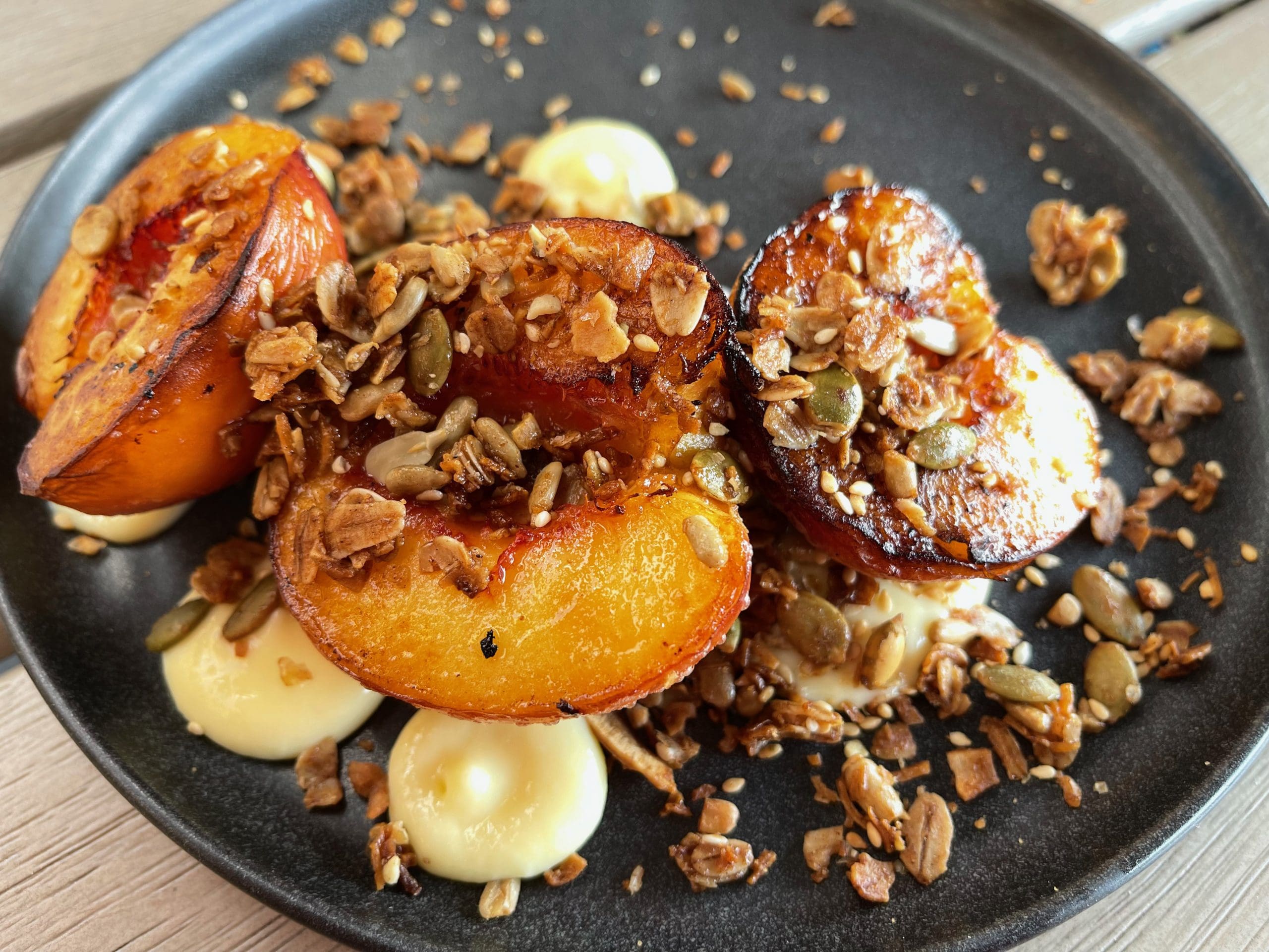 Utah may rank only 14th in peach production, but for sheer taste and juiciness, peaches rank with those from Georgia, the Peach State. Utah’s cool nights and soil conditions are paradise for peach trees. It’s no wonder so many restaurants offer peach-based desserts such as Nomad East’s roasted local peach (green cardamom creme anglaise, house granola). The caramelization process gives the peaches a nutty, almost buttery caramel flavor that brings out even more of the peach’s sweet flavor while the cardamom creme anglaise tastes slightly like melted vanilla ice cream. Then there’s the house granola with its subtly savory notes that counter-balance the sweet and tangy flavors of the peach. This dessert is a showcase for Utah peaches.